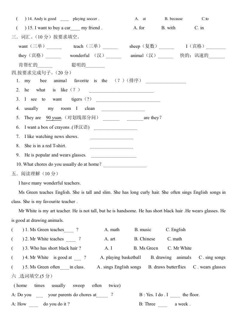 当前位置: 首页小学资源小学五年级正文 五年级英语上册期末试题(人教版一起点)_共2页 小学五年级 6 天前 0 0 5 以上为部分内容预览,如需源文档请登录您的会员账号进行下载! 声明:本站所有文章,如无特殊说明或标注,均为本站原创发布。任何个人或组织,在未征得本站同意时,禁止复制、盗用、采集、发布本站内容到任何网站、书籍等各类媒体平台。如若本站内容侵犯了原著者的合法权益,可联系我们进行处理。 尚学资源永久会员 打赏 收藏 海报 链接