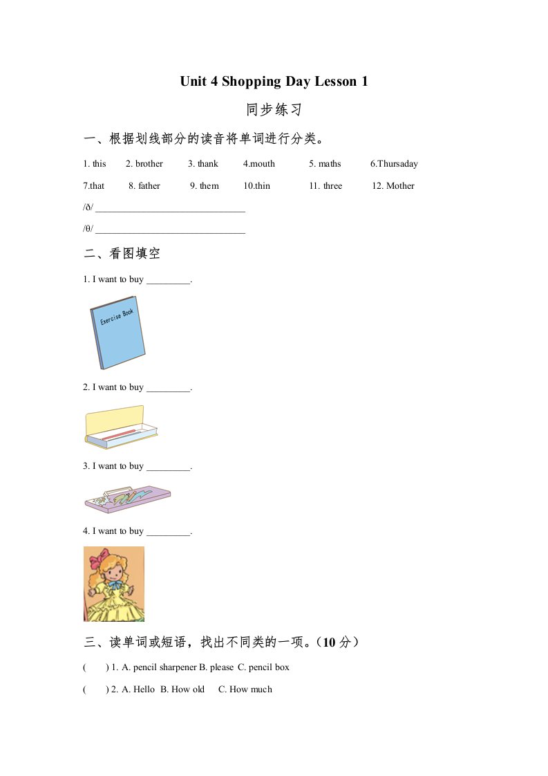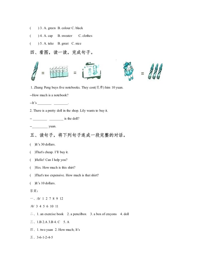 五年级英语上册Unit4ShoppingDayLesson1同步练习3(人教版一起点)_共3页