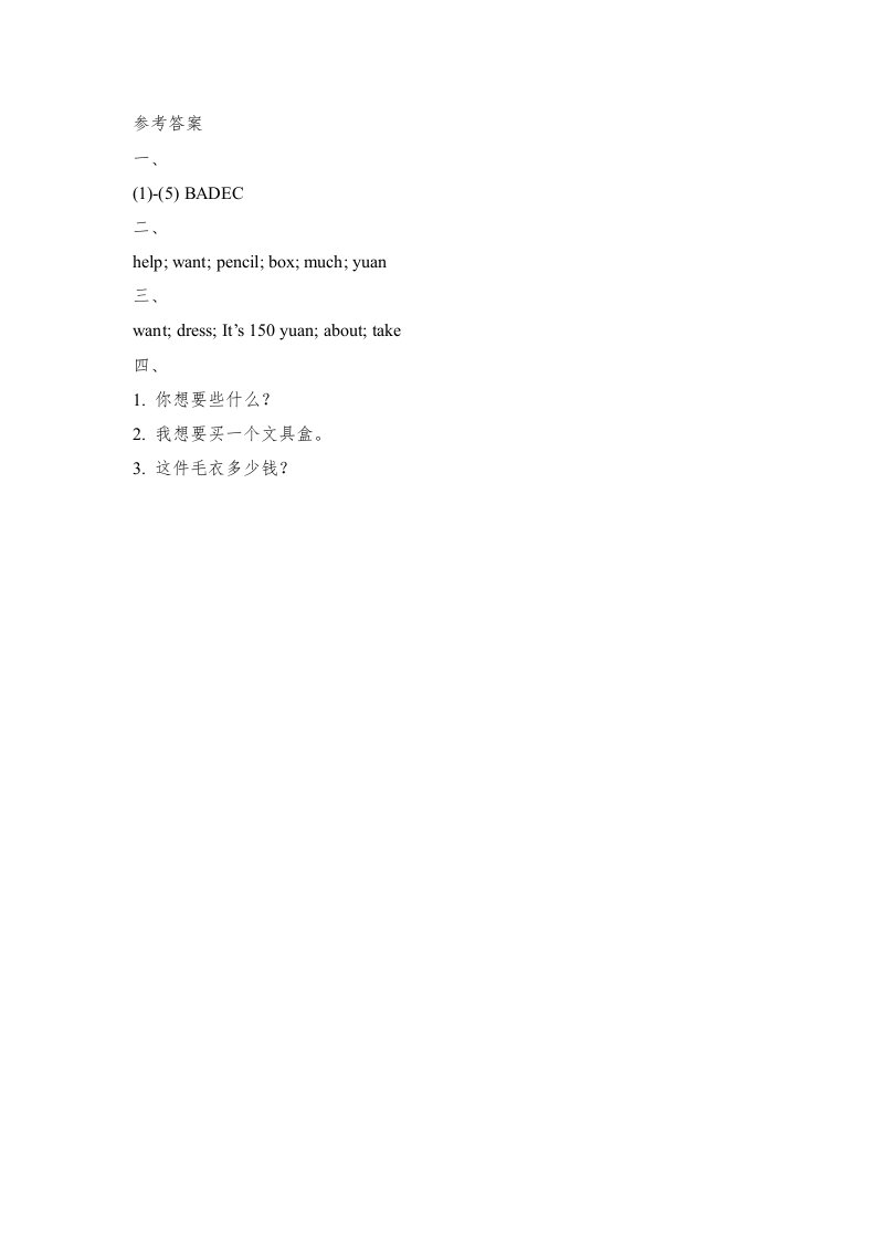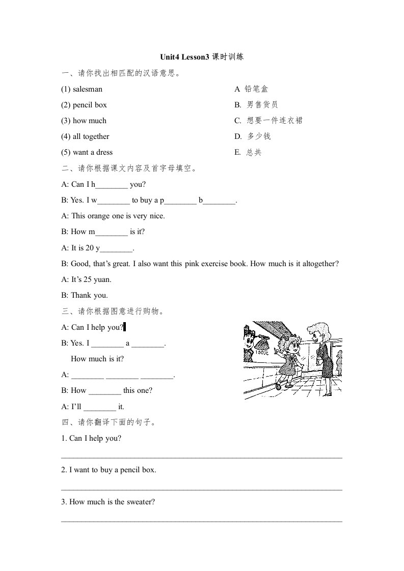 五年级英语上册Unit4_Lesson3课时训练(人教版一起点)_共2页