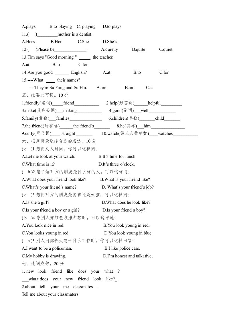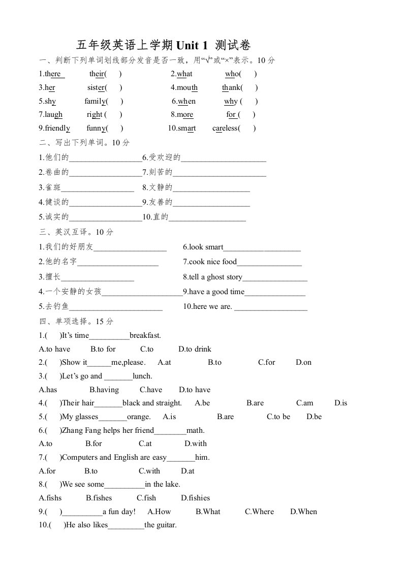 五年级英语上册单元测试卷及参考答案(人教版一起点)_共5页