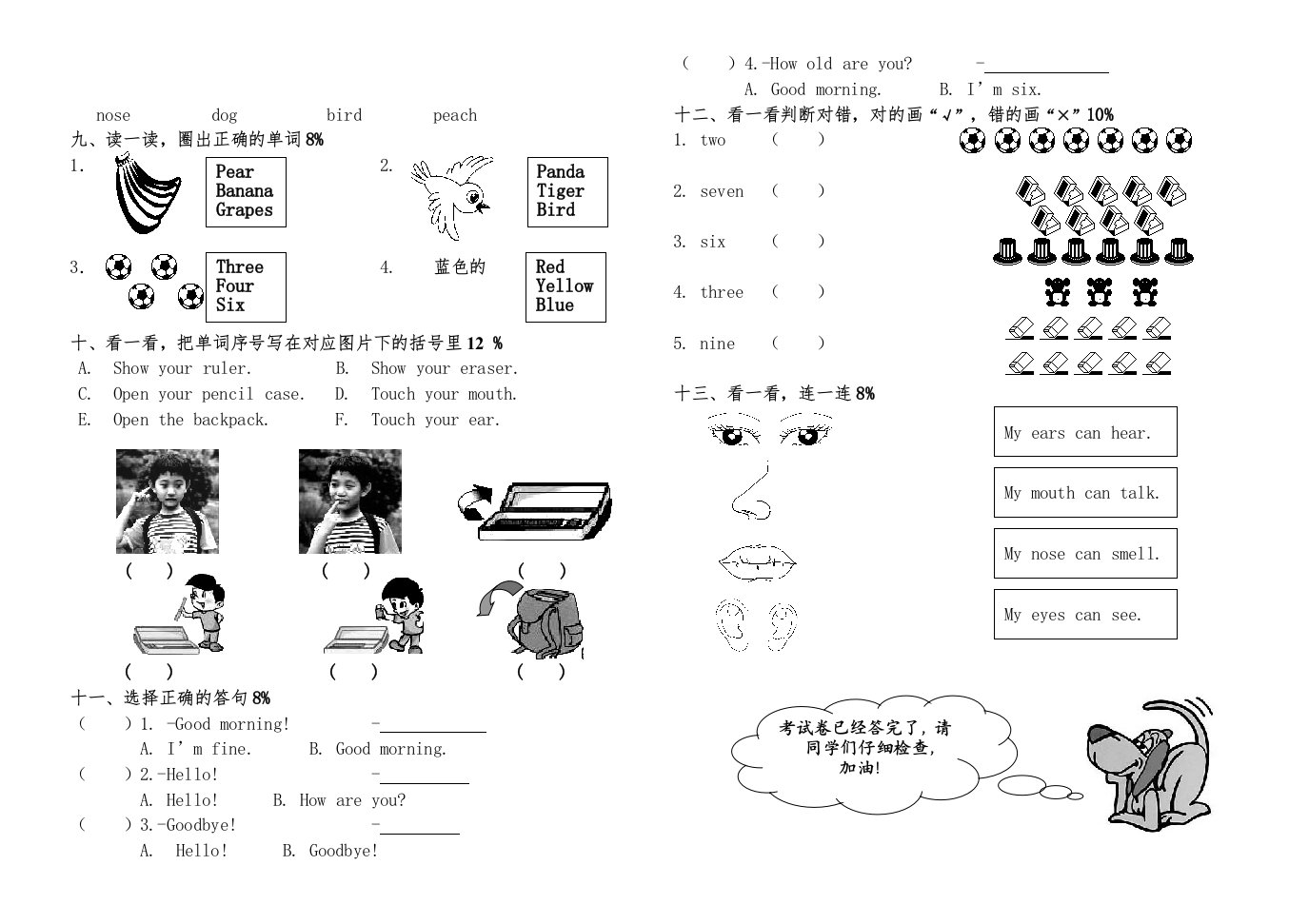 当前位置: 首页小学资源小学一年级正文 一年级英语上册期末测试卷(10)(人教一起点)_共2页 小学一年级 2 周前 0 0 5 以上为部分内容预览,如需源文档请登录您的会员账号进行下载! 声明:本站所有文章,如无特殊说明或标注,均为本站原创发布。任何个人或组织,在未征得本站同意时,禁止复制、盗用、采集、发布本站内容到任何网站、书籍等各类媒体平台。如若本站内容侵犯了原著者的合法权益,可联系我们进行处理。 尚学资源永久会员 打赏 收藏 海报 链接