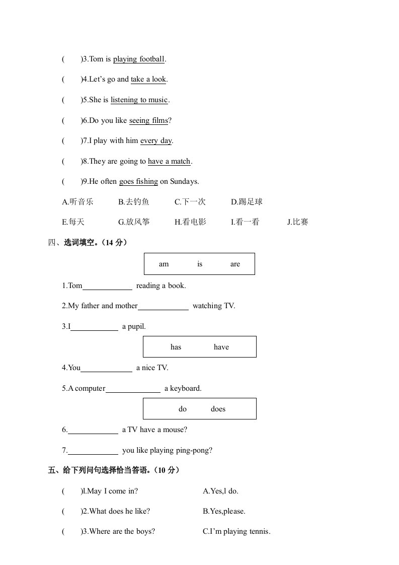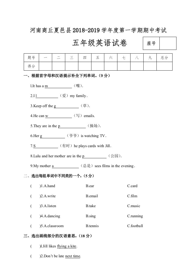 五年级英语上册试卷(A)(人教版PEP)_共5页