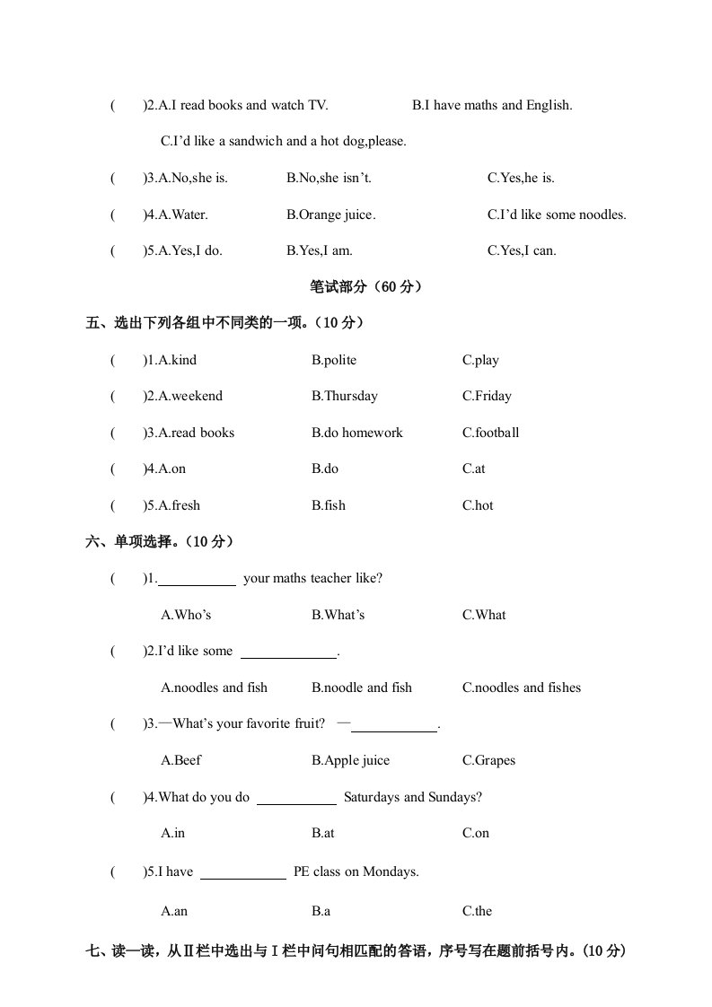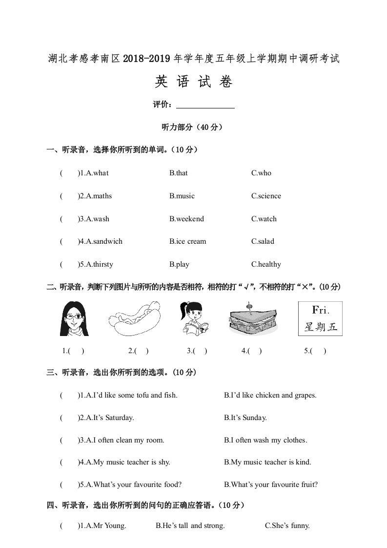 五年级英语上册期中调研考试英语试卷(人教版PEP)_共5页