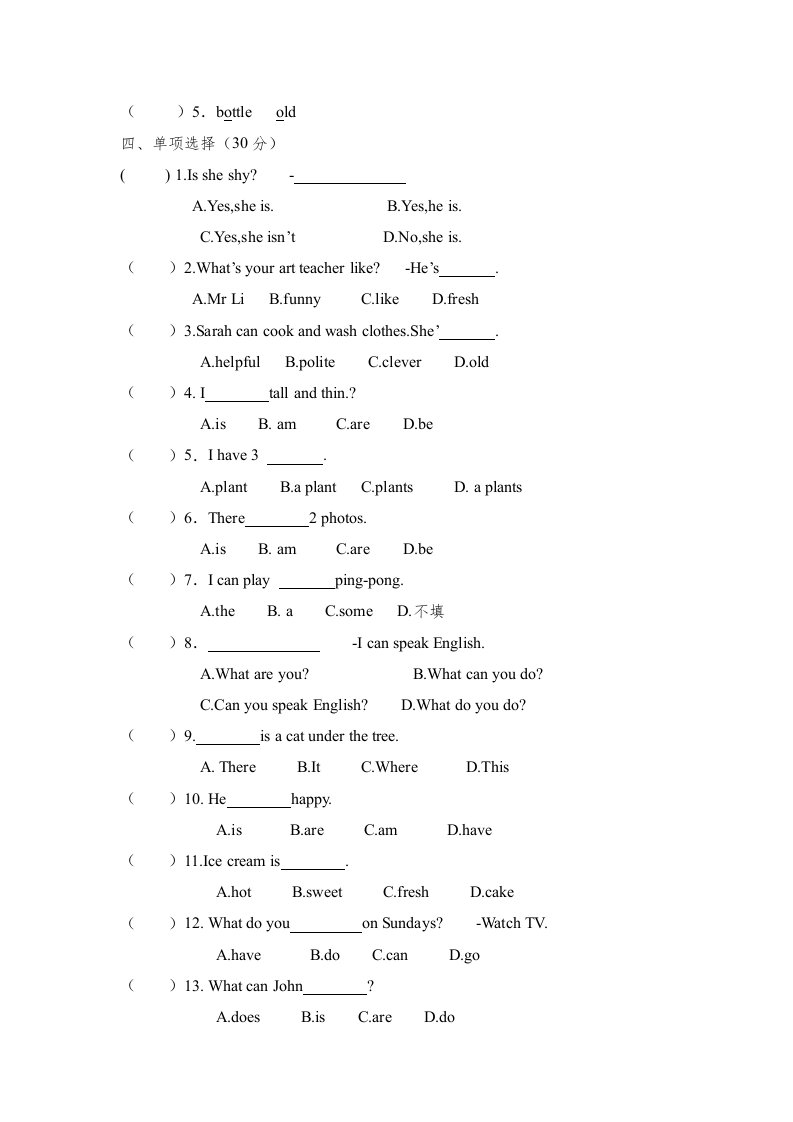 五年级英语上册期末测试卷4(含参考答案)(人教版PEP)_共5页