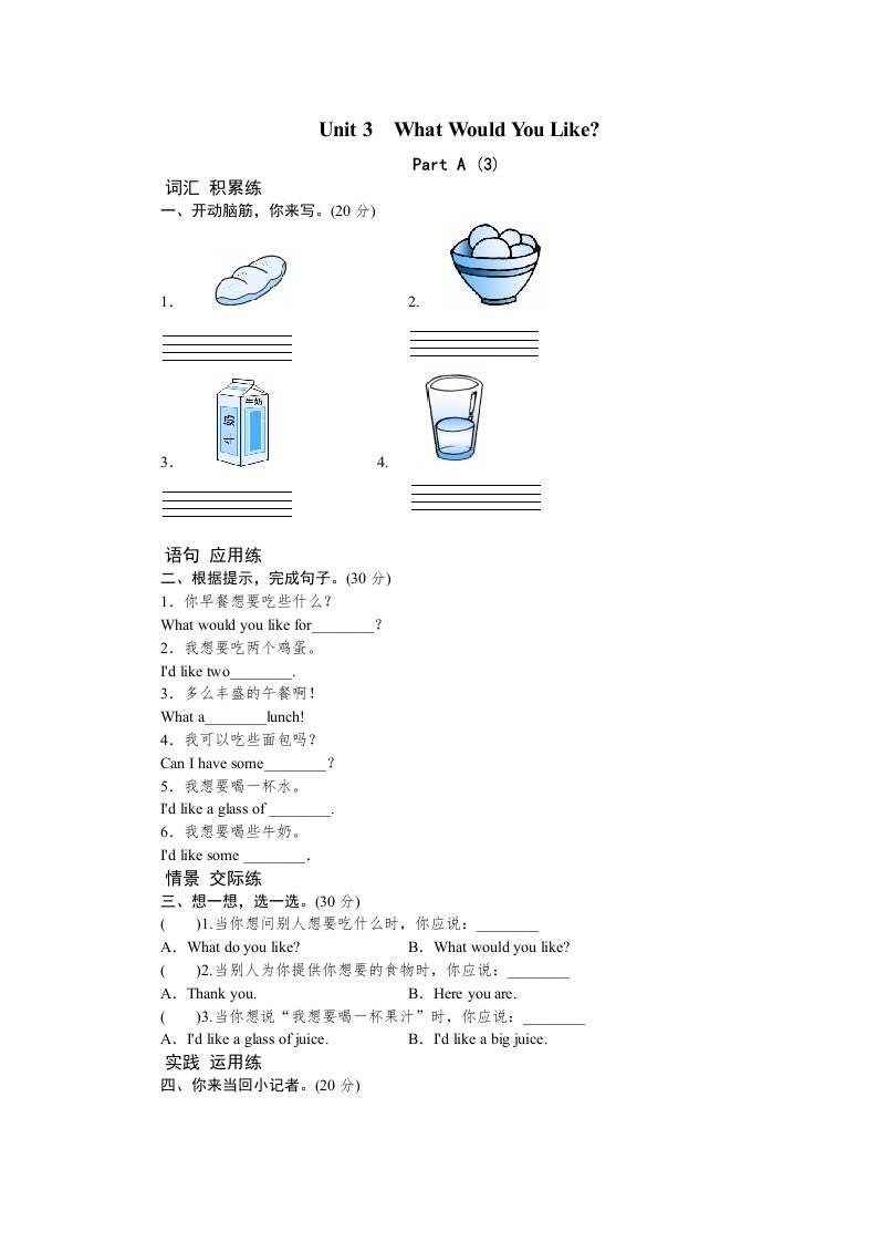 五年级英语上册Unit3WhatwouldyoulikePartA练习及答案(3)(人教版PEP)_共3页
