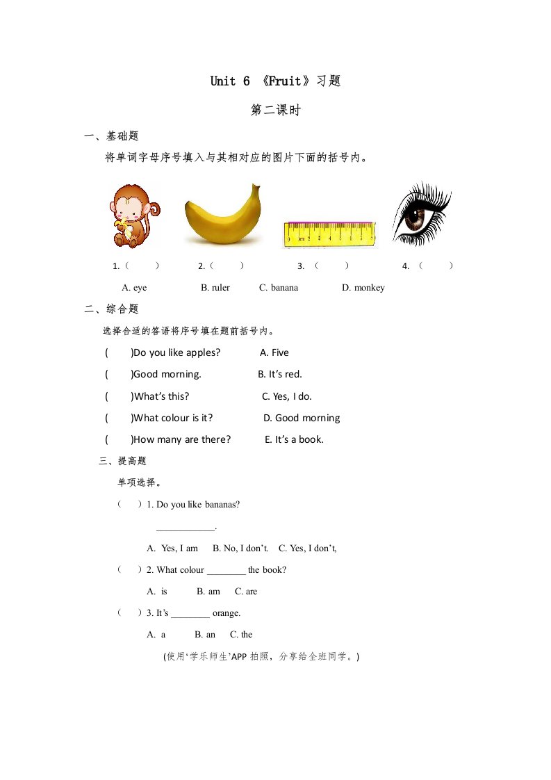 当前位置: 首页小学资源小学一年级正文 一年级英语上册Unit6习题第2课时(人教一起点)_共2页 小学一年级 2 周前 0 0 5 以上为部分内容预览,如需源文档请登录您的会员账号进行下载! 声明:本站所有文章,如无特殊说明或标注,均为本站原创发布。任何个人或组织,在未征得本站同意时,禁止复制、盗用、采集、发布本站内容到任何网站、书籍等各类媒体平台。如若本站内容侵犯了原著者的合法权益,可联系我们进行处理。 尚学资源永久会员 打赏 收藏 海报 链接
