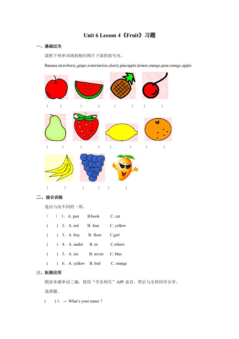 当前位置: 首页小学资源小学一年级正文 一年级英语上册Unit6习题(6)(人教一起点)_共3页 小学一年级 2 周前 0 0 5 以上为部分内容预览,如需源文档请登录您的会员账号进行下载! 声明:本站所有文章,如无特殊说明或标注,均为本站原创发布。任何个人或组织,在未征得本站同意时,禁止复制、盗用、采集、发布本站内容到任何网站、书籍等各类媒体平台。如若本站内容侵犯了原著者的合法权益,可联系我们进行处理。 尚学资源永久会员 打赏 收藏 海报 链接
