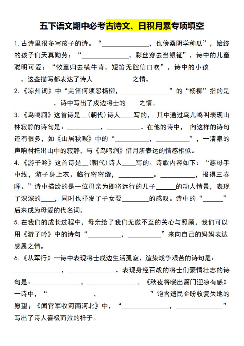 当前位置: 首页小学资源小学五年级正文 五下语文期中必考古诗文、日积月累专项填空_共6页 小学五年级 7 天前 0 0 5 以上为部分内容预览,如需源文档请登录您的会员账号进行下载! 声明:本站所有文章,如无特殊说明或标注,均为本站原创发布。任何个人或组织,在未征得本站同意时,禁止复制、盗用、采集、发布本站内容到任何网站、书籍等各类媒体平台。如若本站内容侵犯了原著者的合法权益,可联系我们进行处理。 尚学资源永久会员 打赏 收藏 海报 链接