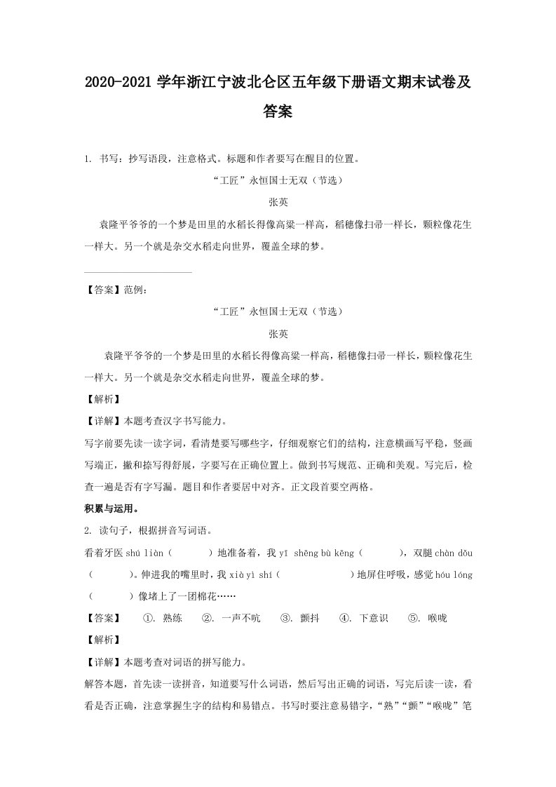 当前位置: 首页小学资源小学五年级正文 2020-2021学年浙江宁波北仑区五年级下册语文期末试卷及答案(Word版)_共18页 小学五年级 6 天前 0 0 10 以上为部分内容预览,如需源文档请登录您的会员账号进行下载! 声明:本站所有文章,如无特殊说明或标注,均为本站原创发布。任何个人或组织,在未征得本站同意时,禁止复制、盗用、采集、发布本站内容到任何网站、书籍等各类媒体平台。如若本站内容侵犯了原著者的合法权益,可联系我们进行处理。 尚学资源永久会员 打赏 收藏 海报 链接