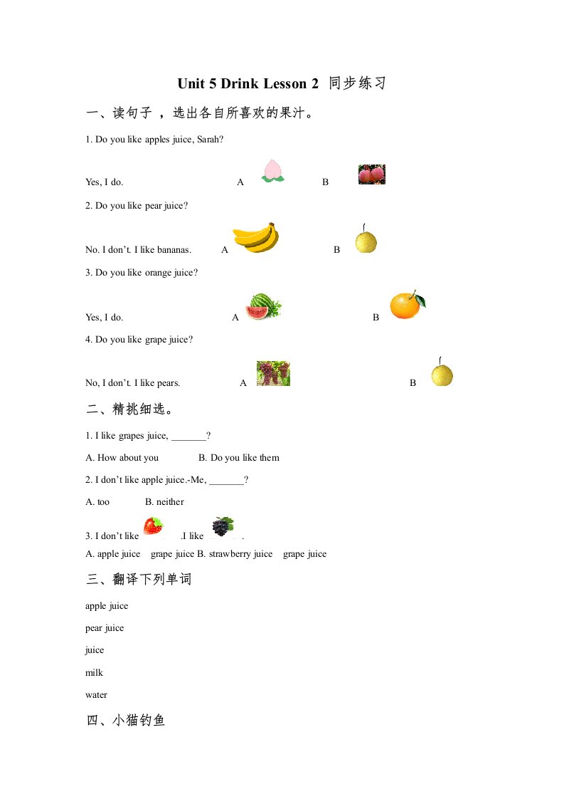 当前位置: 首页小学资源小学一年级正文 一年级英语上册Unit5DrinkLesson2同步练习1(人教一起点)_共2页 小学一年级 2 周前 0 0 5 以上为部分内容预览,如需源文档请登录您的会员账号进行下载! 声明:本站所有文章,如无特殊说明或标注,均为本站原创发布。任何个人或组织,在未征得本站同意时,禁止复制、盗用、采集、发布本站内容到任何网站、书籍等各类媒体平台。如若本站内容侵犯了原著者的合法权益,可联系我们进行处理。 尚学资源永久会员 打赏 收藏 海报 链接