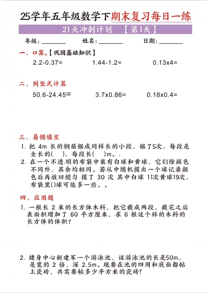 当前位置: 首页小学资源小学五年级正文 25五下数学期末复习每日一练21天冲刺计划_共21页 小学五年级 6 天前 0 0 15 以上为部分内容预览,如需源文档请登录您的会员账号进行下载! 声明:本站所有文章,如无特殊说明或标注,均为本站原创发布。任何个人或组织,在未征得本站同意时,禁止复制、盗用、采集、发布本站内容到任何网站、书籍等各类媒体平台。如若本站内容侵犯了原著者的合法权益,可联系我们进行处理。 尚学资源永久会员 打赏 收藏 海报 链接