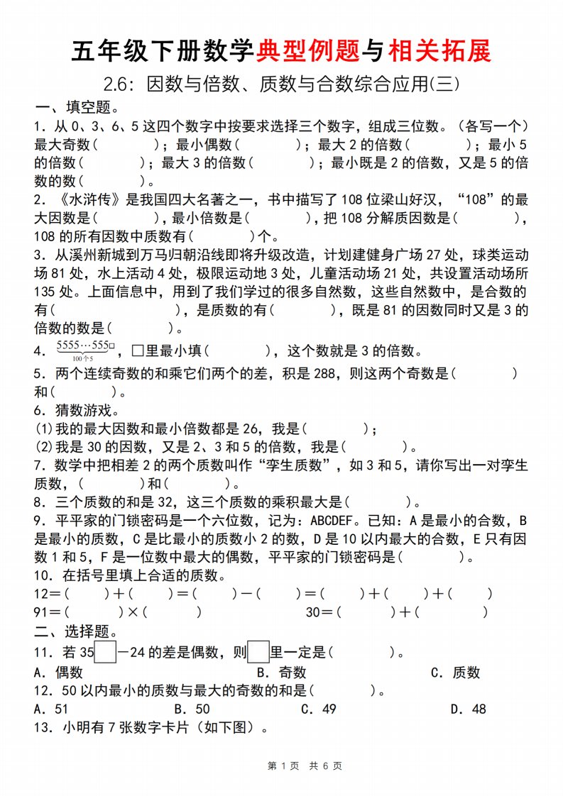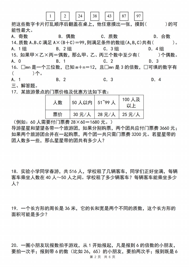 当前位置: 首页小学资源小学五年级正文 【人教版】五年级下册数学典型例题与相关拓展(2-6因数与倍数综合应用三)_共6页 小学五年级 6 天前 0 0 5 以上为部分内容预览,如需源文档请登录您的会员账号进行下载! 声明:本站所有文章,如无特殊说明或标注,均为本站原创发布。任何个人或组织,在未征得本站同意时,禁止复制、盗用、采集、发布本站内容到任何网站、书籍等各类媒体平台。如若本站内容侵犯了原著者的合法权益,可联系我们进行处理。 尚学资源永久会员 打赏 收藏 海报 链接