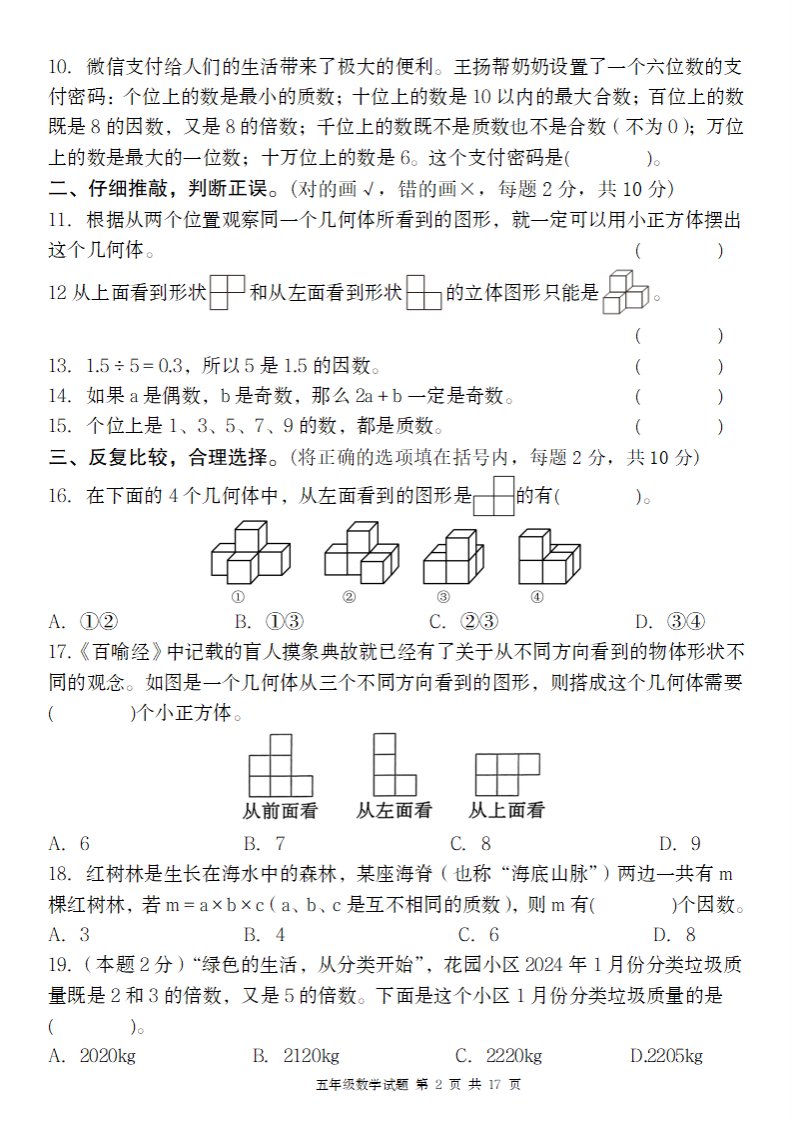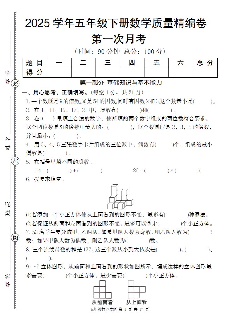 【人教版】2025学年五年级下册数学第一次月考质量精编卷_共17页