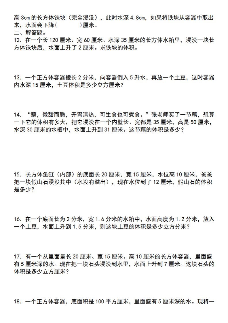 当前位置: 首页小学资源小学五年级正文 【通用版】五年级下册数学典型例题与相关拓展(3-2排水法求不规则物体的体积“一般问题”)_共11页 小学五年级 6 天前 0 0 10 以上为部分内容预览,如需源文档请登录您的会员账号进行下载! 声明:本站所有文章,如无特殊说明或标注,均为本站原创发布。任何个人或组织,在未征得本站同意时,禁止复制、盗用、采集、发布本站内容到任何网站、书籍等各类媒体平台。如若本站内容侵犯了原著者的合法权益,可联系我们进行处理。 尚学资源永久会员 打赏 收藏 海报 链接