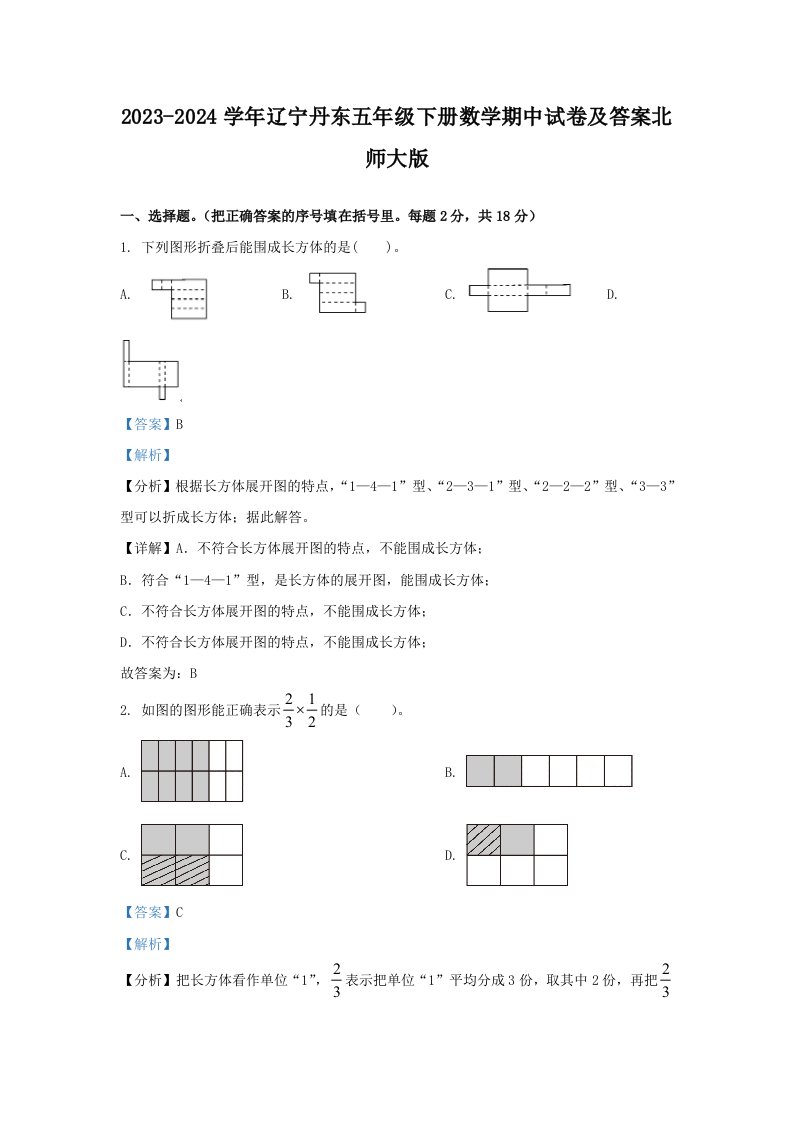 2023-2024学年辽宁丹东五年级下册数学期中试卷及答案北师大版(Word版)_共19页