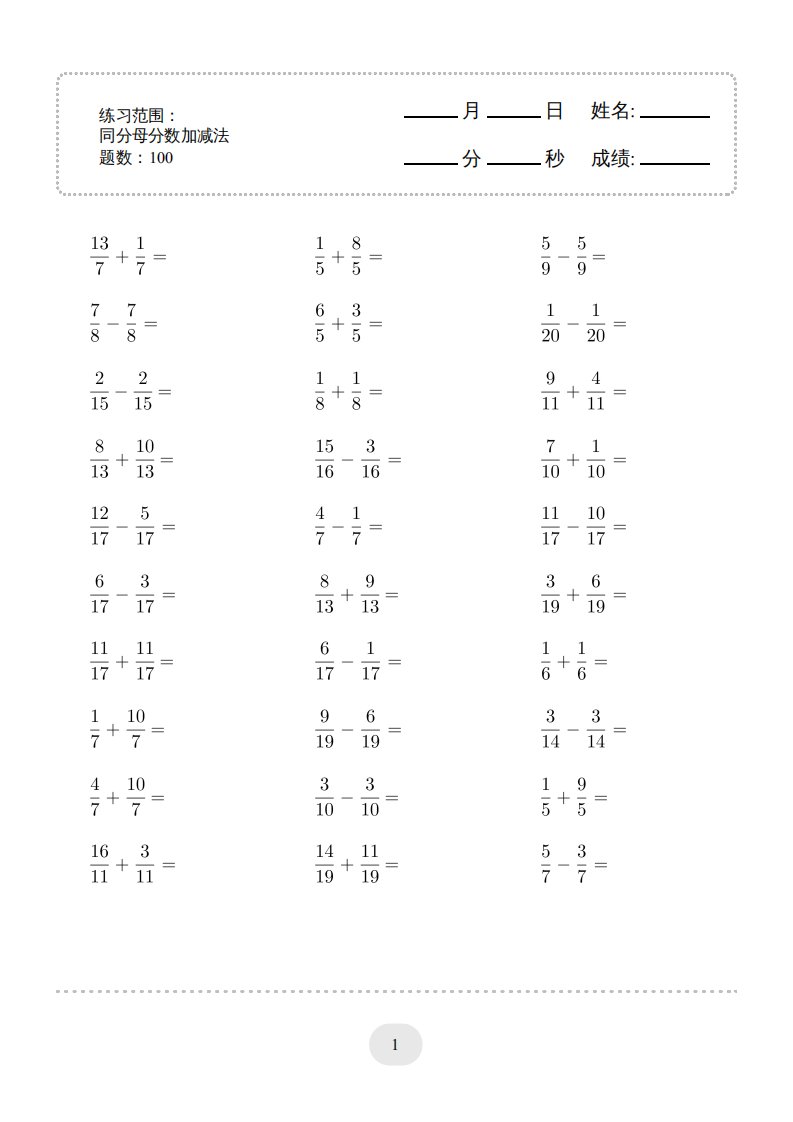 五年级数学下册口算题(同分母分数加减法)1500题(人教版)_共45页