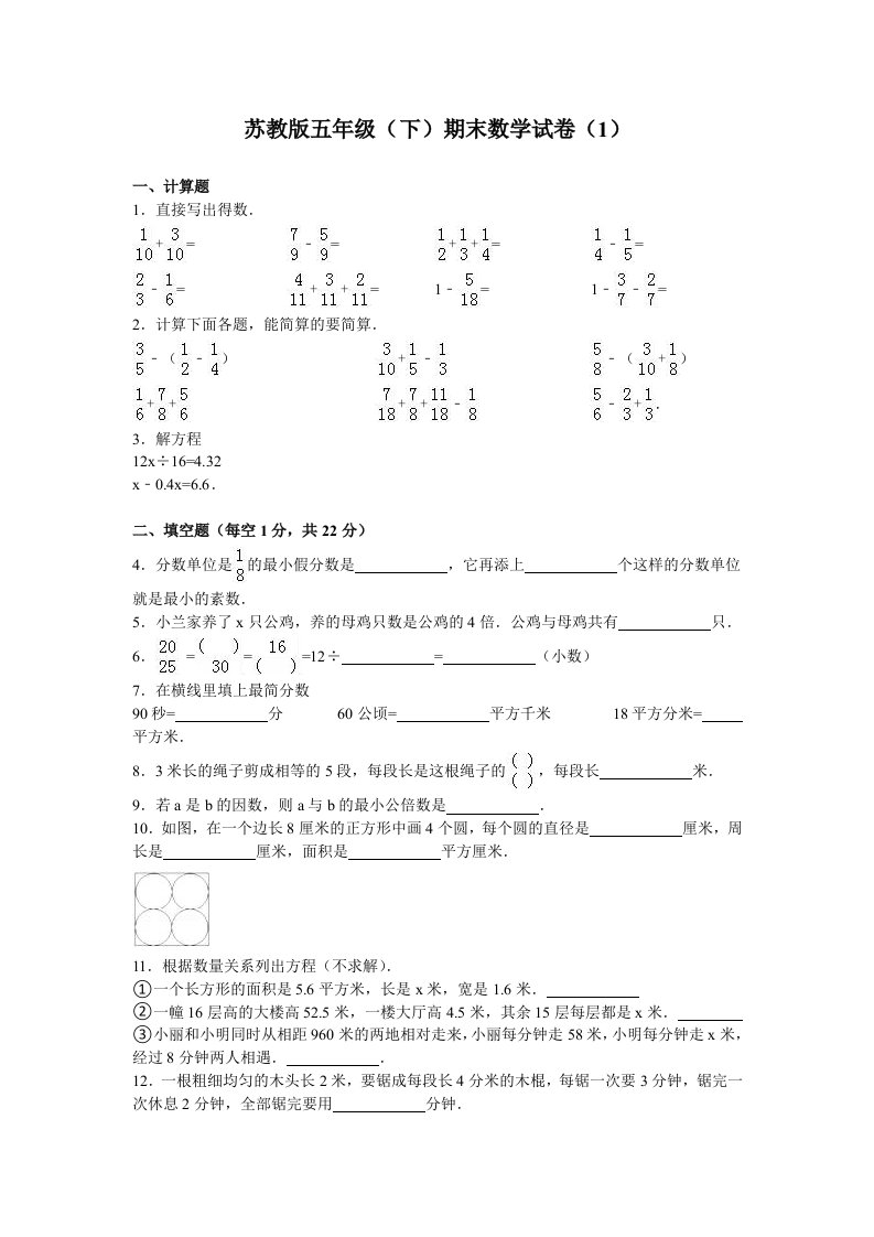 五年级数学下册苏教版下学期期末测试卷8_共16页