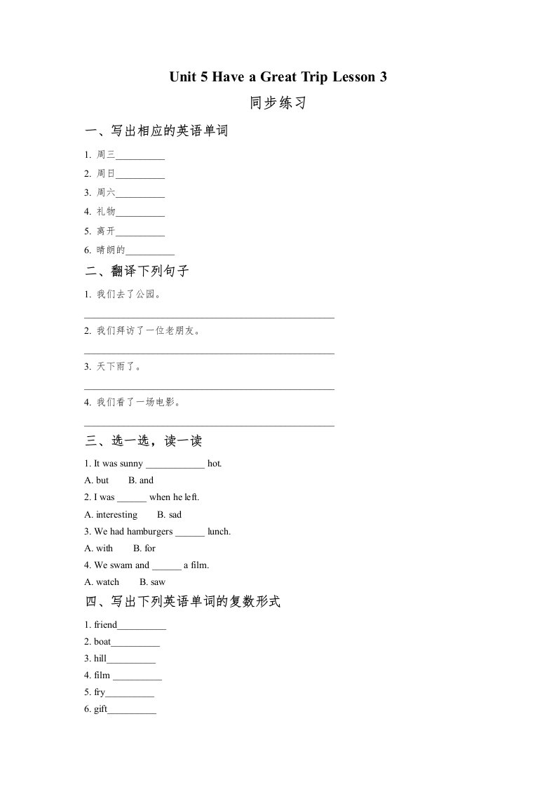 当前位置: 首页小学资源小学五年级正文 五年级英语下册Unit5HaveaGreatTripLesson3同步练习2(人教版)_共2页 小学五年级 6 天前 0 0 5 以上为部分内容预览,如需源文档请登录您的会员账号进行下载! 声明:本站所有文章,如无特殊说明或标注,均为本站原创发布。任何个人或组织,在未征得本站同意时,禁止复制、盗用、采集、发布本站内容到任何网站、书籍等各类媒体平台。如若本站内容侵犯了原著者的合法权益,可联系我们进行处理。 尚学资源永久会员 打赏 收藏 海报 链接