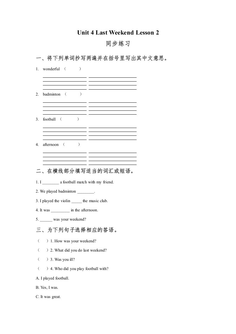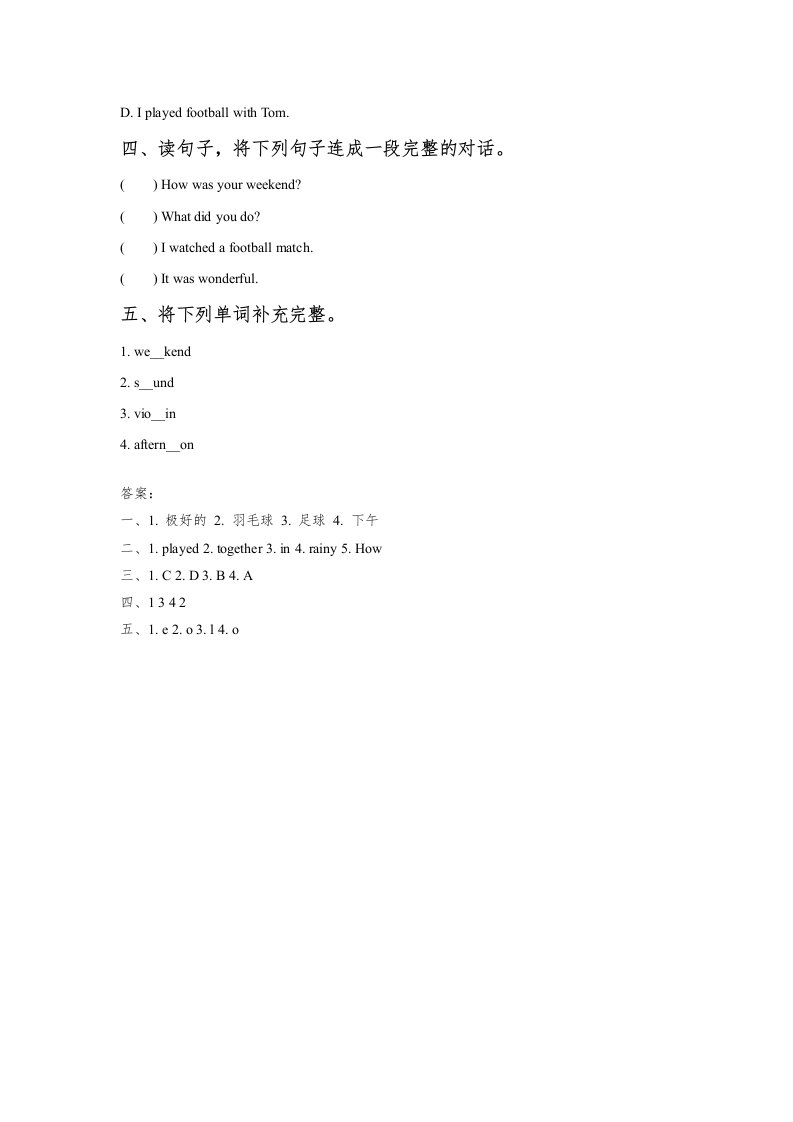 当前位置: 首页小学资源小学五年级正文 五年级英语下册Unit4LastWeekendLesson2同步练习1(人教版)_共2页 小学五年级 6 天前 0 0 5 以上为部分内容预览,如需源文档请登录您的会员账号进行下载! 声明:本站所有文章,如无特殊说明或标注,均为本站原创发布。任何个人或组织,在未征得本站同意时,禁止复制、盗用、采集、发布本站内容到任何网站、书籍等各类媒体平台。如若本站内容侵犯了原著者的合法权益,可联系我们进行处理。 尚学资源永久会员 打赏 收藏 海报 链接