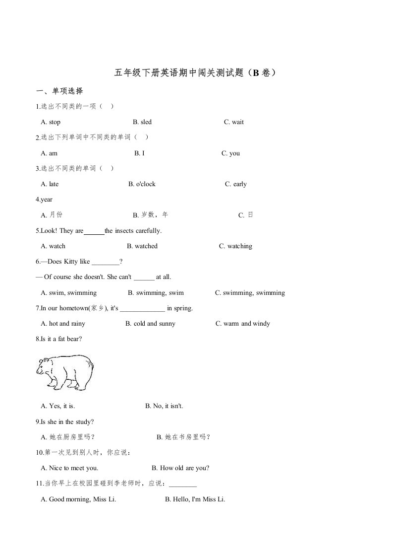 五年级英语下册期中测试(2)(人教版)_共12页