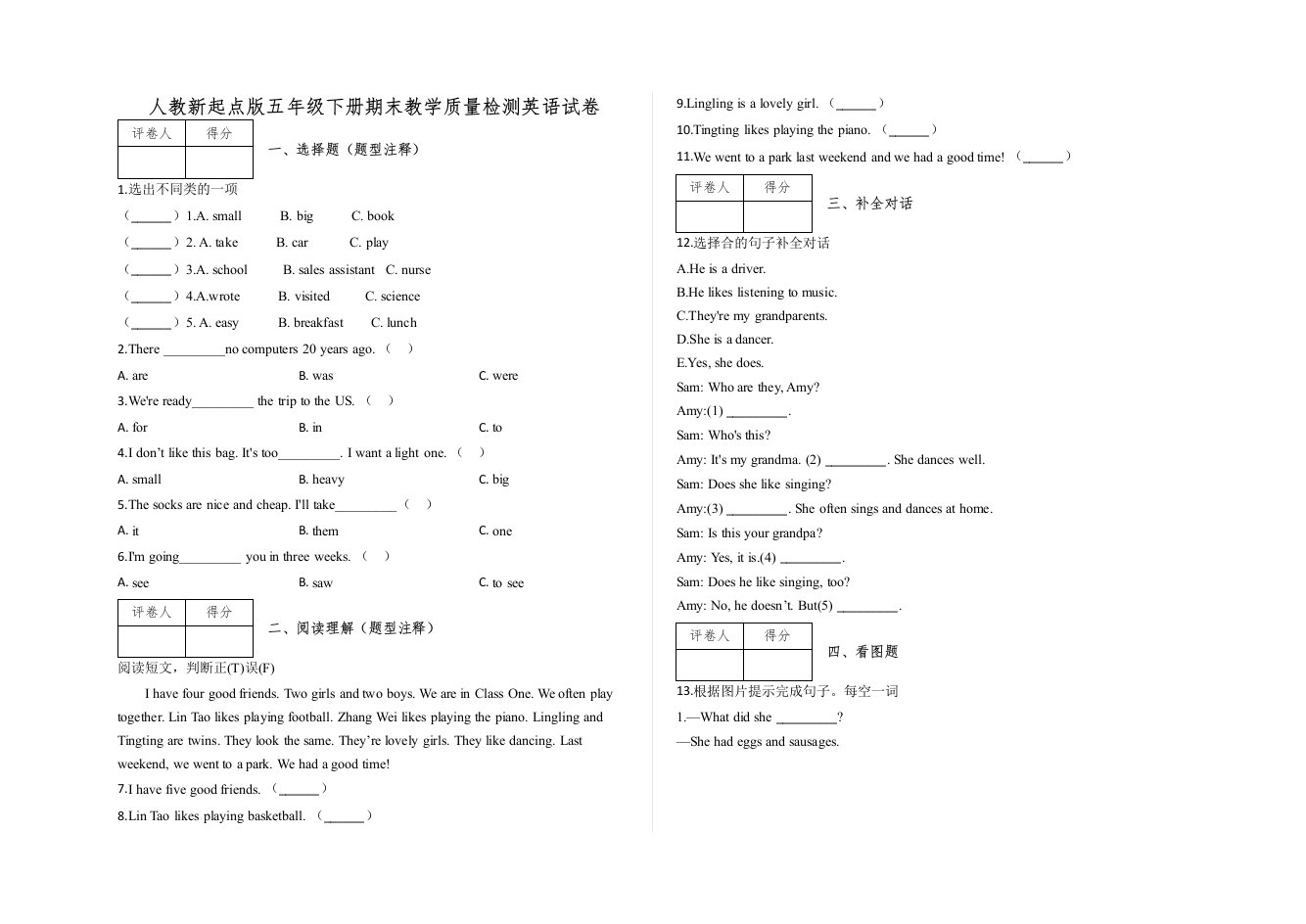 当前位置: 首页小学资源小学五年级正文 五年级英语下册期末测试(8)(人教版)_共3页 小学五年级 6 天前 0 0 5 以上为部分内容预览,如需源文档请登录您的会员账号进行下载! 声明:本站所有文章,如无特殊说明或标注,均为本站原创发布。任何个人或组织,在未征得本站同意时,禁止复制、盗用、采集、发布本站内容到任何网站、书籍等各类媒体平台。如若本站内容侵犯了原著者的合法权益,可联系我们进行处理。 尚学资源永久会员 打赏 收藏 海报 链接