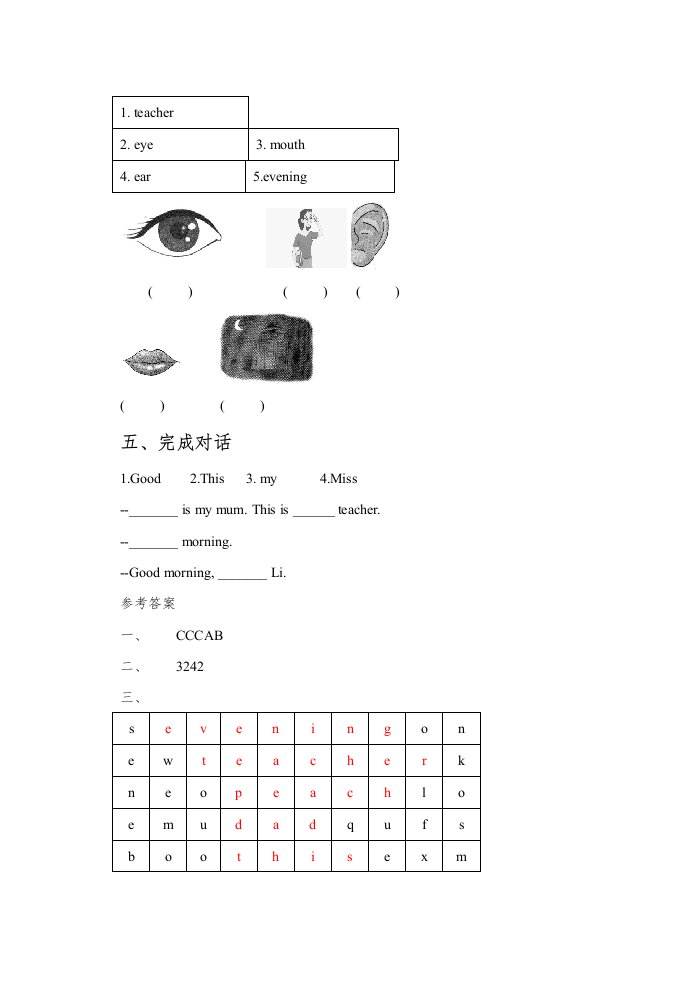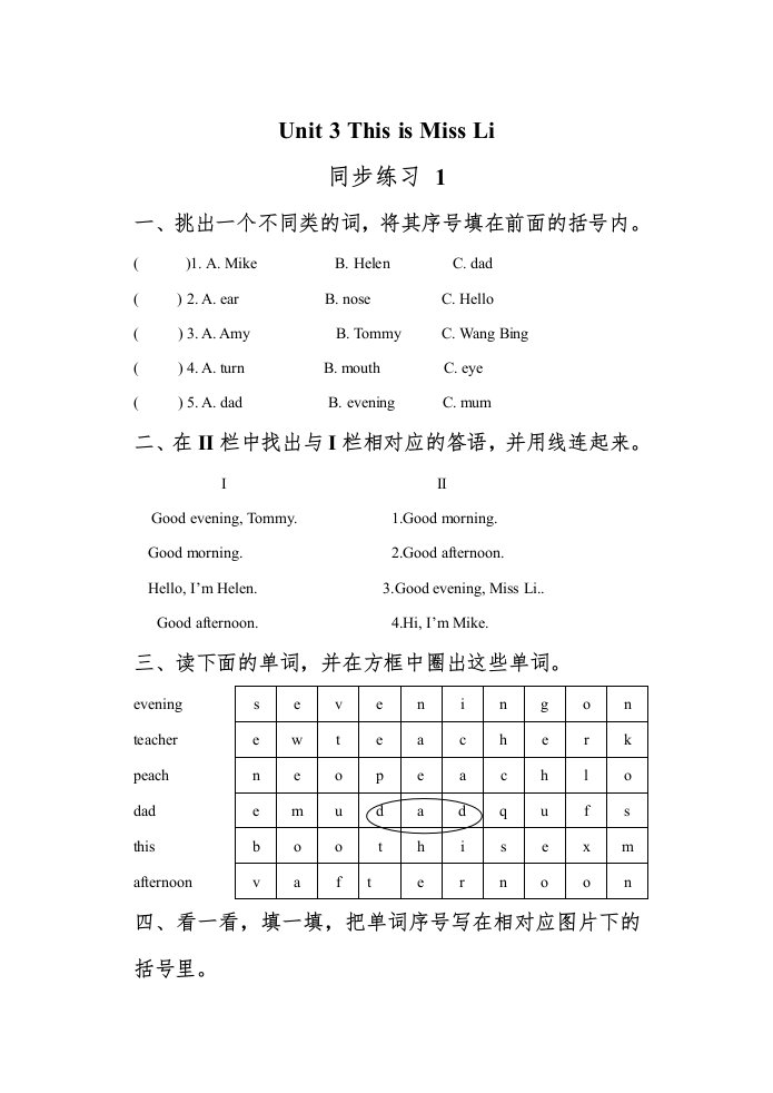 一年级英语上册Unit3ThisisMissLi同步练习1(人教一起点)_共3页