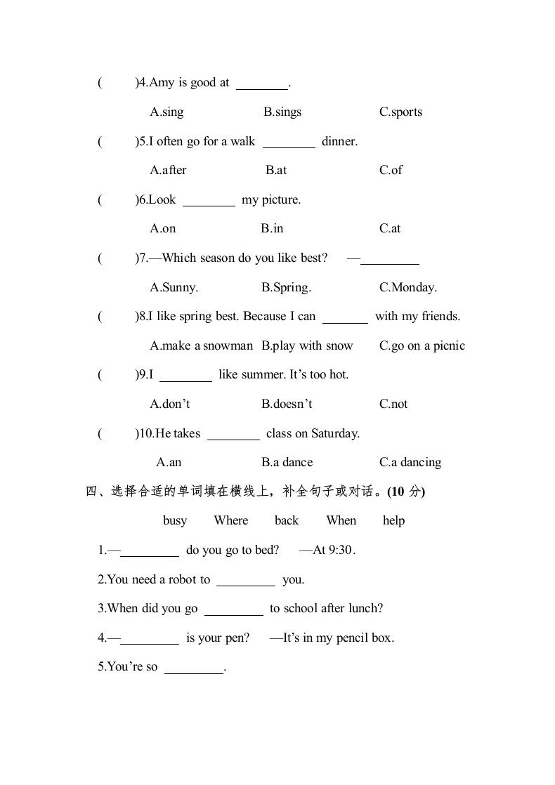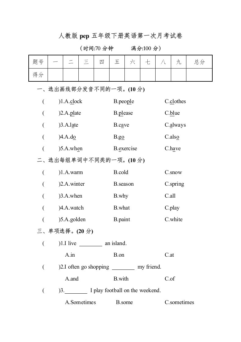 五年级英语下册2.pep第一次月考试卷(含答案)(人教PEP版)_共5页