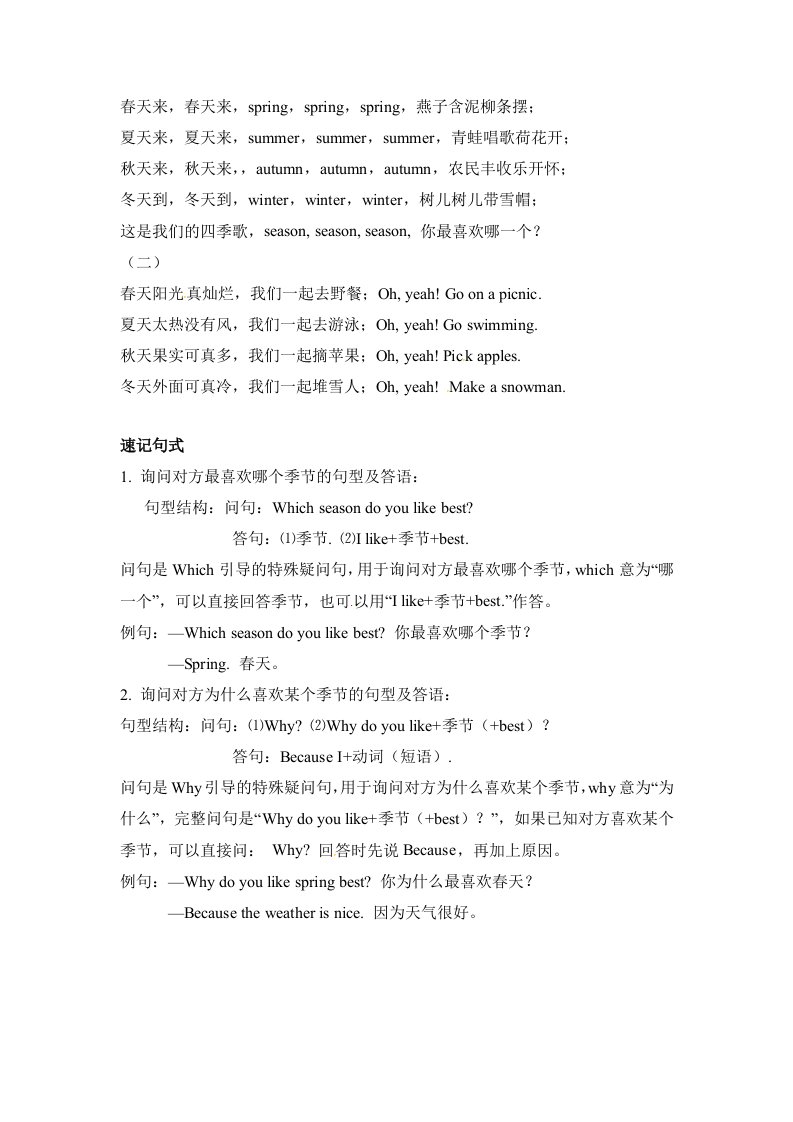 五年级数学下册英语单元知识梳理-Unit2Myfavouriteseason人教PEP_共2页