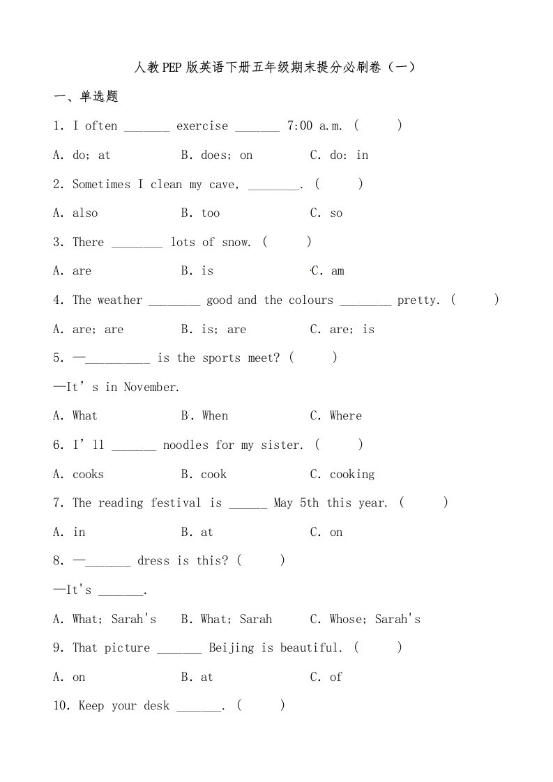 五年级数学下册人教PEP版英语期末提分必刷卷(一)(有答案)_共9页