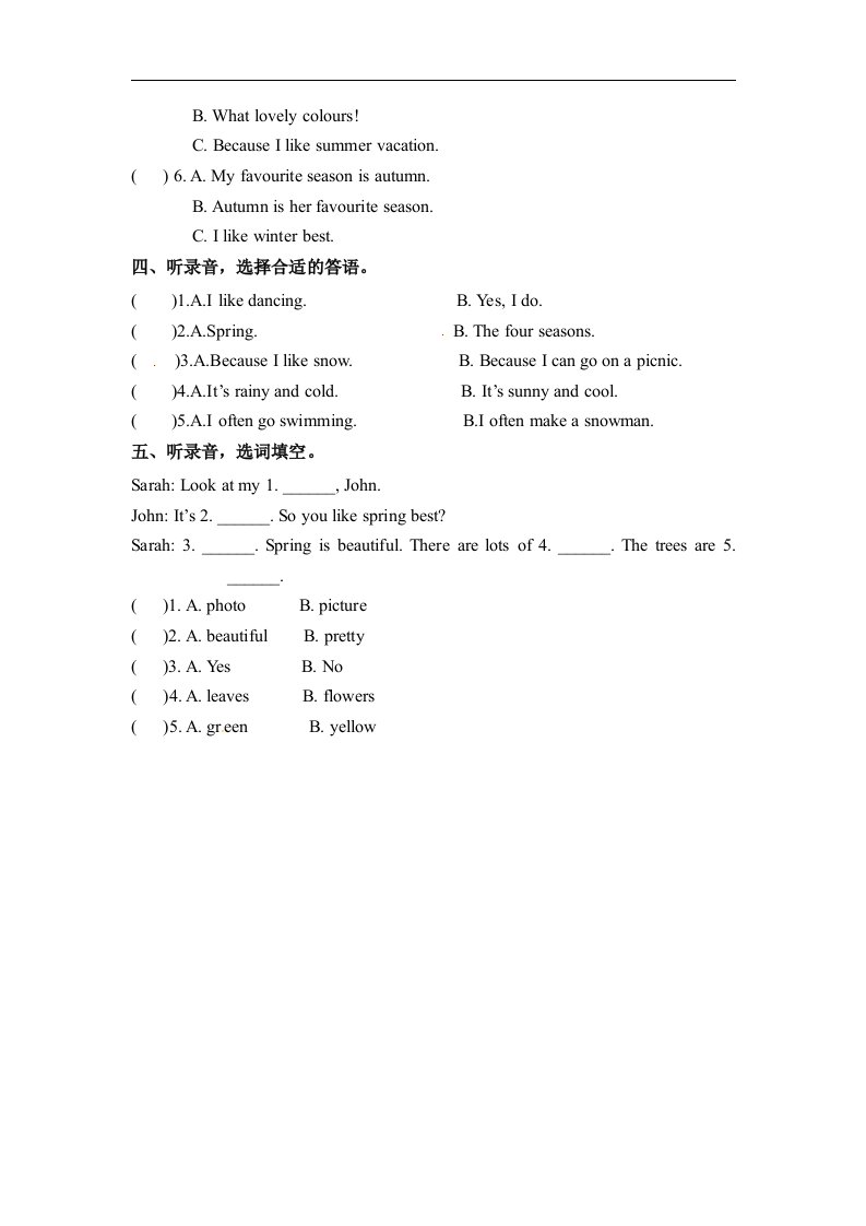 当前位置: 首页小学资源小学五年级正文 五年级数学下册英语同步听力训练-Unit2MyfavouriteseasonPartB人教PEP版_共4页 小学五年级 6 天前 0 0 5 以上为部分内容预览,如需源文档请登录您的会员账号进行下载! 声明:本站所有文章,如无特殊说明或标注,均为本站原创发布。任何个人或组织,在未征得本站同意时,禁止复制、盗用、采集、发布本站内容到任何网站、书籍等各类媒体平台。如若本站内容侵犯了原著者的合法权益,可联系我们进行处理。 尚学资源永久会员 打赏 收藏 海报 链接