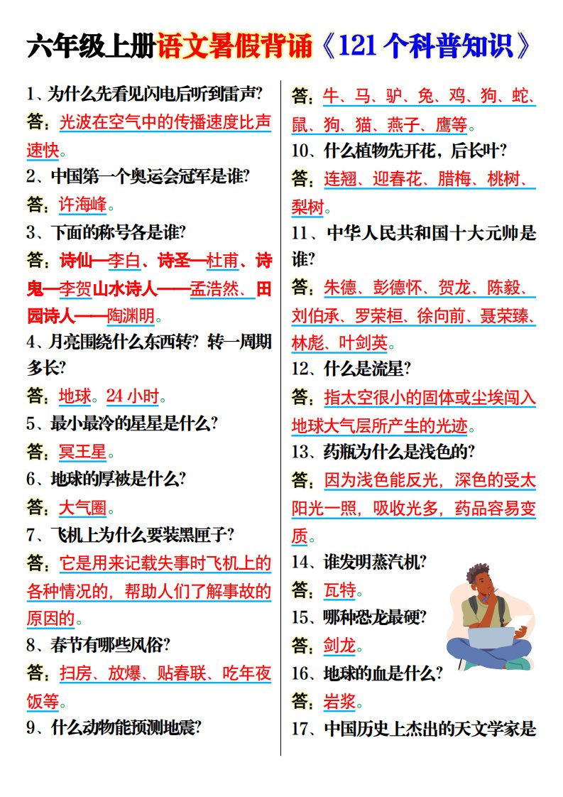 当前位置: 首页小学资源小学六年级正文 六上语文背诵《121个科普知识》7页_共7页 小学六年级 7 天前 0 0 5 以上为部分内容预览,如需源文档请登录您的会员账号进行下载! 声明:本站所有文章,如无特殊说明或标注,均为本站原创发布。任何个人或组织,在未征得本站同意时,禁止复制、盗用、采集、发布本站内容到任何网站、书籍等各类媒体平台。如若本站内容侵犯了原著者的合法权益,可联系我们进行处理。 尚学资源永久会员 打赏 收藏 海报 链接