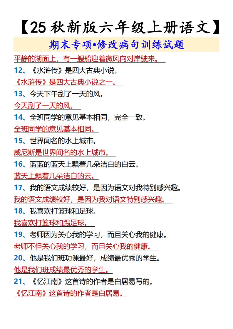 当前位置: 首页小学资源小学六年级正文 【2025秋新版】【六年级上册语文】期末专项•修改病句训练试题_共4页 小学六年级 6 天前 0 0 5 以上为部分内容预览,如需源文档请登录您的会员账号进行下载! 声明:本站所有文章,如无特殊说明或标注,均为本站原创发布。任何个人或组织,在未征得本站同意时,禁止复制、盗用、采集、发布本站内容到任何网站、书籍等各类媒体平台。如若本站内容侵犯了原著者的合法权益,可联系我们进行处理。 尚学资源永久会员 打赏 收藏 海报 链接