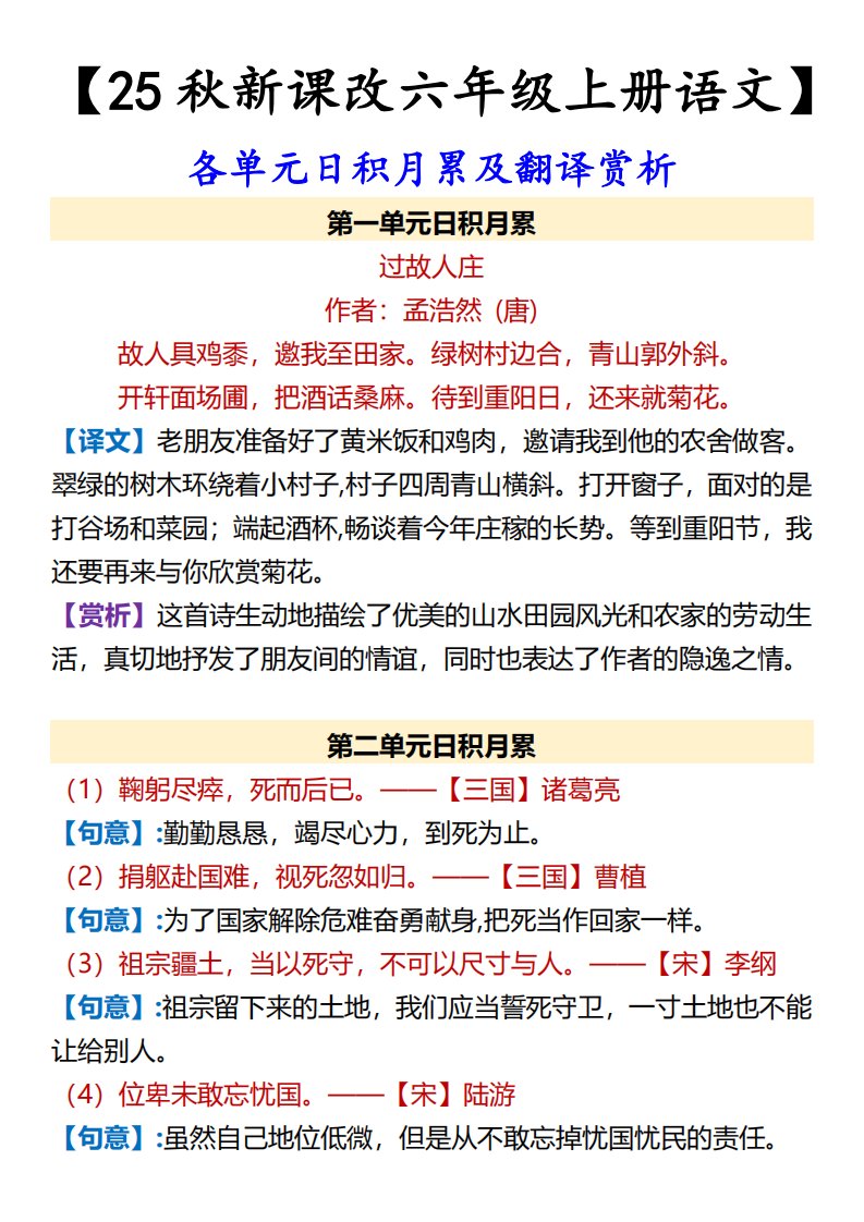 当前位置: 首页小学资源小学六年级正文 【2025秋新版】【六年级上册语文】各单元日积月累及翻译赏析_共4页 小学六年级 7 天前 0 0 5 以上为部分内容预览,如需源文档请登录您的会员账号进行下载! 声明:本站所有文章,如无特殊说明或标注,均为本站原创发布。任何个人或组织,在未征得本站同意时,禁止复制、盗用、采集、发布本站内容到任何网站、书籍等各类媒体平台。如若本站内容侵犯了原著者的合法权益,可联系我们进行处理。 尚学资源永久会员 打赏 收藏 海报 链接