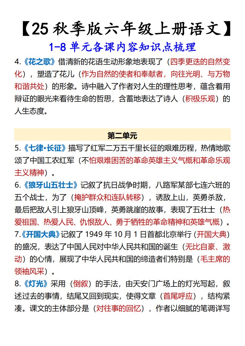 当前位置: 首页小学资源小学六年级正文 【2025秋新版】【六年级上册语文】1-8单元各课内容知识点梳理_共7页 小学六年级 6 天前 0 0 5 以上为部分内容预览,如需源文档请登录您的会员账号进行下载! 声明:本站所有文章,如无特殊说明或标注,均为本站原创发布。任何个人或组织,在未征得本站同意时,禁止复制、盗用、采集、发布本站内容到任何网站、书籍等各类媒体平台。如若本站内容侵犯了原著者的合法权益,可联系我们进行处理。 尚学资源永久会员 打赏 收藏 海报 链接