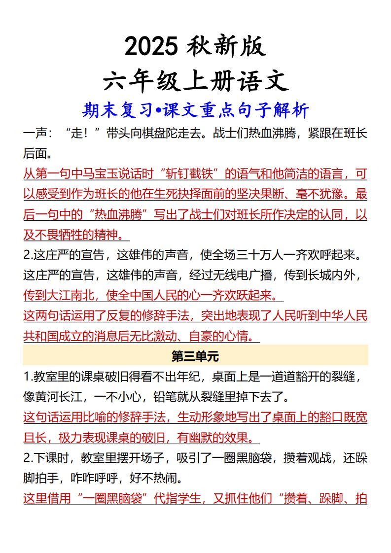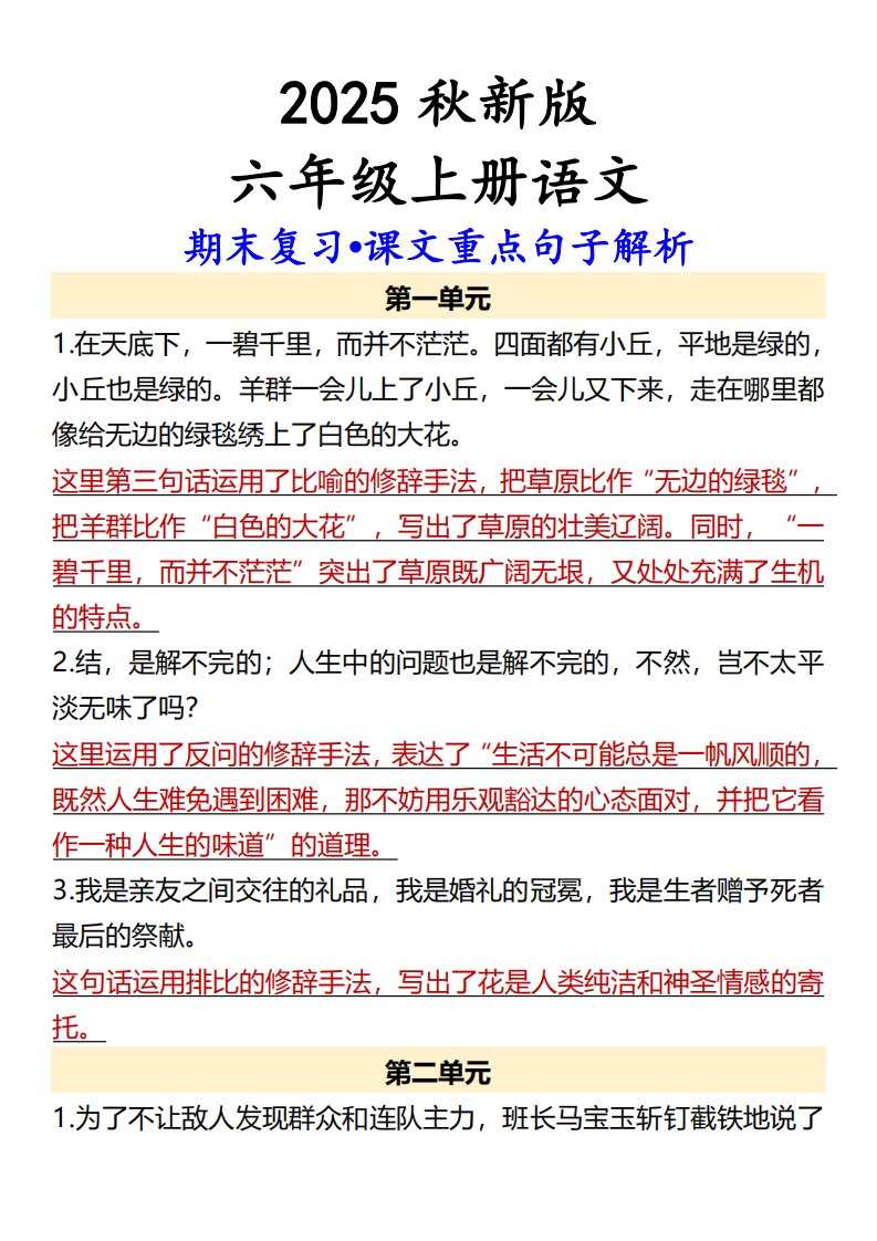 当前位置: 首页小学资源小学六年级正文 【2025秋新版】【六年级上册语文】期末复习•课文重点句子解析_共6页 小学六年级 6 天前 0 0 5 以上为部分内容预览,如需源文档请登录您的会员账号进行下载! 声明:本站所有文章,如无特殊说明或标注,均为本站原创发布。任何个人或组织,在未征得本站同意时,禁止复制、盗用、采集、发布本站内容到任何网站、书籍等各类媒体平台。如若本站内容侵犯了原著者的合法权益,可联系我们进行处理。 尚学资源永久会员 打赏 收藏 海报 链接