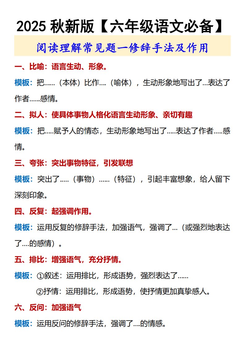 当前位置: 首页小学资源小学六年级正文 【2025秋新版】【六年级语文必备】修辞手法及作用-六上语文_共1页 小学六年级 6 天前 0 0 5 以上为部分内容预览,如需源文档请登录您的会员账号进行下载! 声明:本站所有文章,如无特殊说明或标注,均为本站原创发布。任何个人或组织,在未征得本站同意时,禁止复制、盗用、采集、发布本站内容到任何网站、书籍等各类媒体平台。如若本站内容侵犯了原著者的合法权益,可联系我们进行处理。 尚学资源永久会员 打赏 收藏 海报 链接