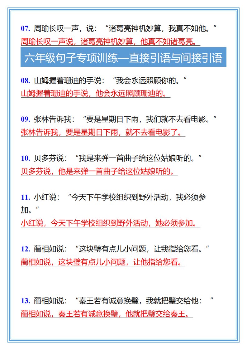 当前位置: 首页小学资源小学六年级正文 【2025秋新版】六年级句子专项训练-直接引语与间接引语-六上语文_共3页 小学六年级 6 天前 0 0 5 以上为部分内容预览,如需源文档请登录您的会员账号进行下载! 声明:本站所有文章,如无特殊说明或标注,均为本站原创发布。任何个人或组织,在未征得本站同意时,禁止复制、盗用、采集、发布本站内容到任何网站、书籍等各类媒体平台。如若本站内容侵犯了原著者的合法权益,可联系我们进行处理。 尚学资源永久会员 打赏 收藏 海报 链接