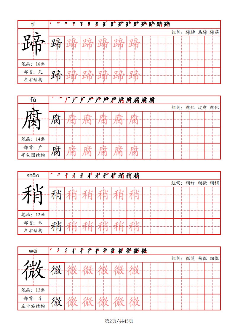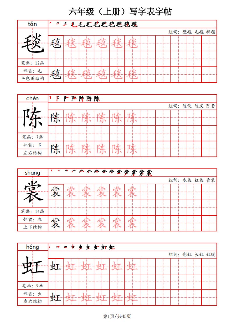 当前位置: 首页小学资源小学六年级正文 六上语文-写字表字帖(笔画+部首+笔顺+组词)_共45页 小学六年级 6 天前 0 0 15 以上为部分内容预览,如需源文档请登录您的会员账号进行下载! 声明:本站所有文章,如无特殊说明或标注,均为本站原创发布。任何个人或组织,在未征得本站同意时,禁止复制、盗用、采集、发布本站内容到任何网站、书籍等各类媒体平台。如若本站内容侵犯了原著者的合法权益,可联系我们进行处理。 尚学资源永久会员 打赏 收藏 海报 链接