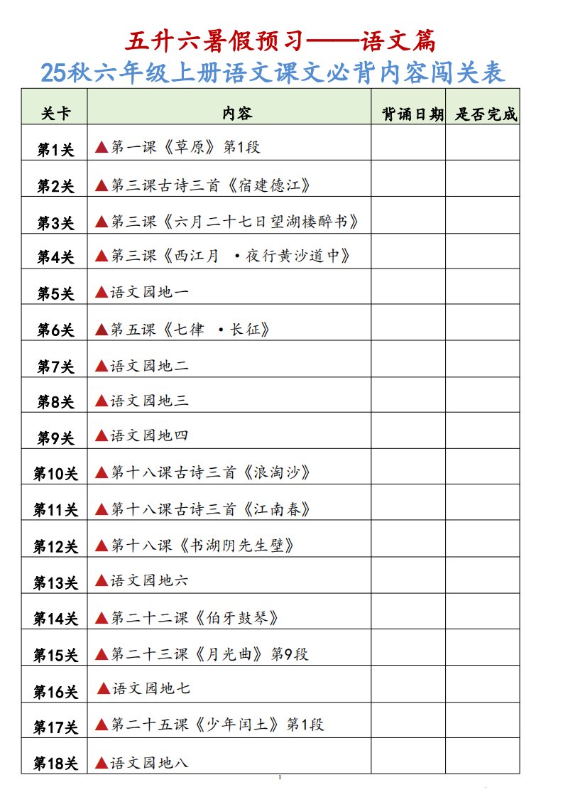 当前位置: 首页小学资源小学六年级正文 25秋六上语文课文必背内容背诵闯关表7页_共7页 小学六年级 6 天前 0 0 5 以上为部分内容预览,如需源文档请登录您的会员账号进行下载! 声明:本站所有文章,如无特殊说明或标注,均为本站原创发布。任何个人或组织,在未征得本站同意时,禁止复制、盗用、采集、发布本站内容到任何网站、书籍等各类媒体平台。如若本站内容侵犯了原著者的合法权益,可联系我们进行处理。 尚学资源永久会员 打赏 收藏 海报 链接