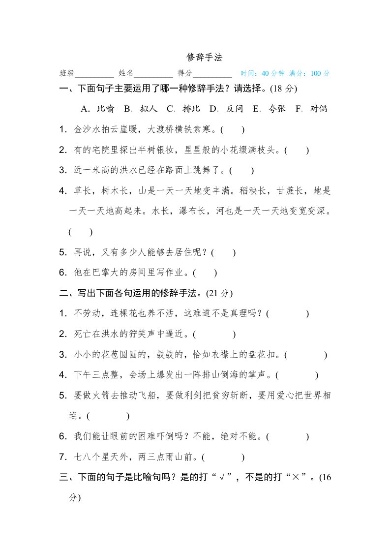 当前位置: 首页小学资源小学六年级正文 六年级语文上册修辞手法(部编版)_共6页 小学六年级 7 天前 0 0 5 以上为部分内容预览,如需源文档请登录您的会员账号进行下载! 声明:本站所有文章,如无特殊说明或标注,均为本站原创发布。任何个人或组织,在未征得本站同意时,禁止复制、盗用、采集、发布本站内容到任何网站、书籍等各类媒体平台。如若本站内容侵犯了原著者的合法权益,可联系我们进行处理。 尚学资源永久会员 打赏 收藏 海报 链接