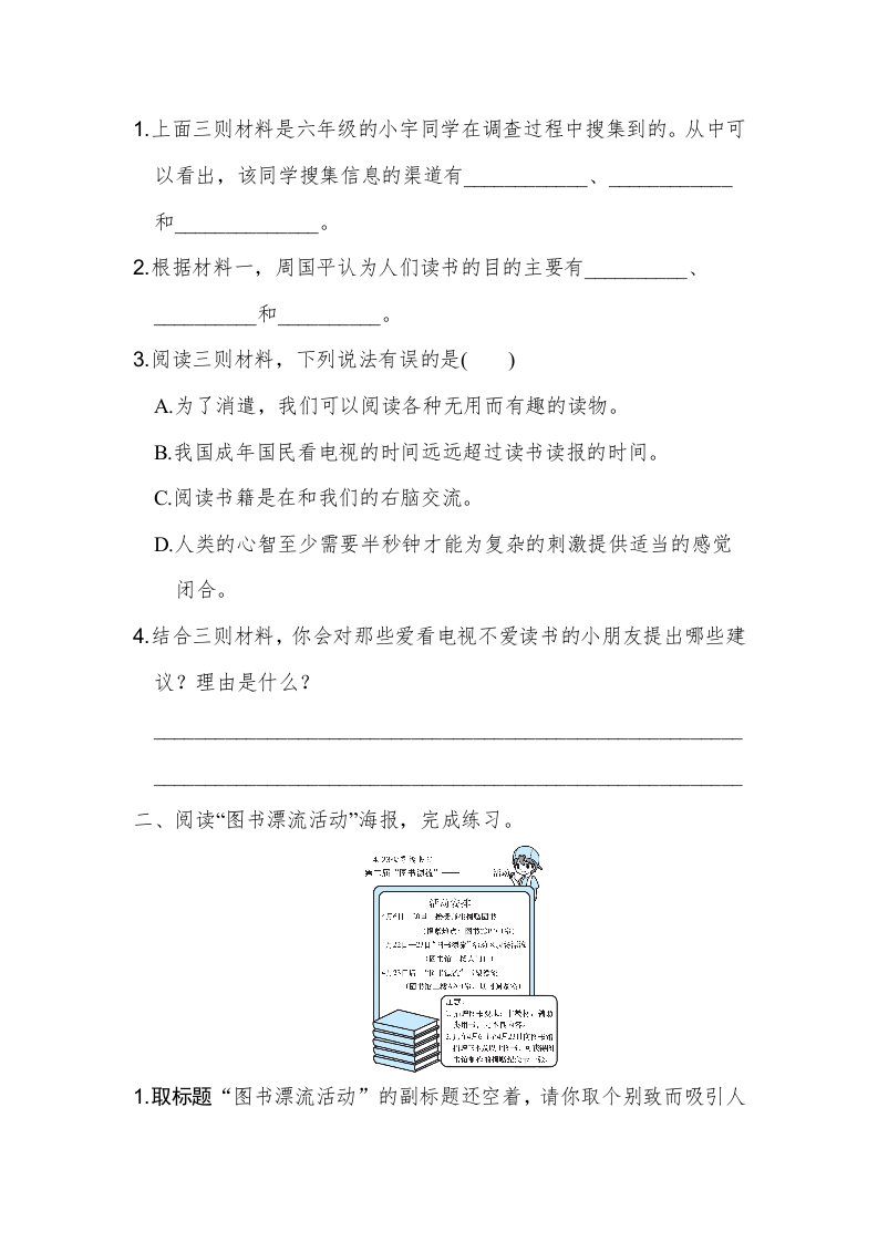 当前位置: 首页小学资源小学六年级正文 六年级语文上册第三、四单元非连续性文本阅读(部编版)_共4页 小学六年级 6 天前 0 0 5 以上为部分内容预览,如需源文档请登录您的会员账号进行下载! 声明:本站所有文章,如无特殊说明或标注,均为本站原创发布。任何个人或组织,在未征得本站同意时,禁止复制、盗用、采集、发布本站内容到任何网站、书籍等各类媒体平台。如若本站内容侵犯了原著者的合法权益,可联系我们进行处理。 尚学资源永久会员 打赏 收藏 海报 链接