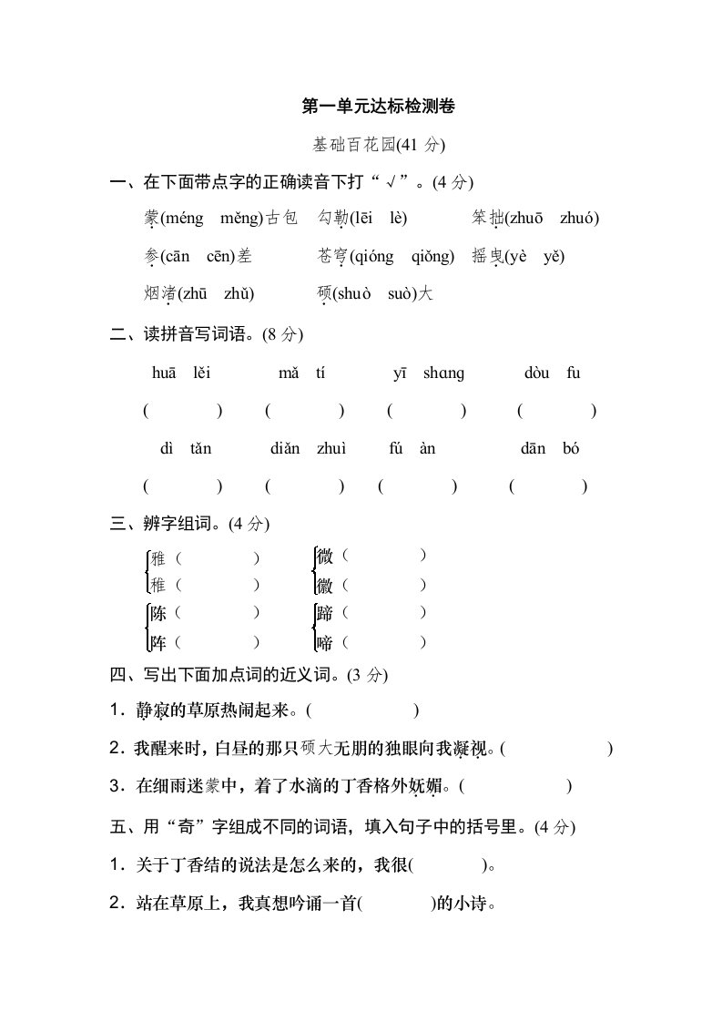 六年级语文上册第一单元达标检测卷(二)(部编版)_共10页
