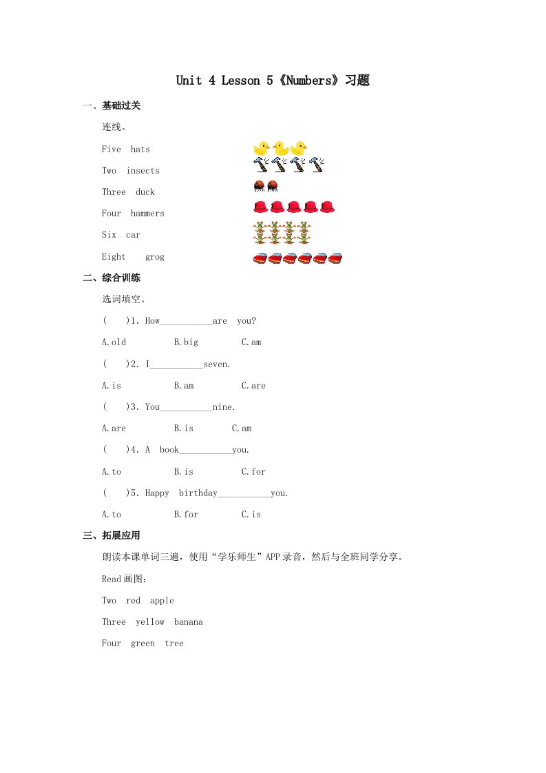 当前位置: 首页小学资源小学一年级正文 一年级英语上册Numbers习题第5课时(人教一起点)_共2页 小学一年级 2 周前 0 0 5 以上为部分内容预览,如需源文档请登录您的会员账号进行下载! 声明:本站所有文章,如无特殊说明或标注,均为本站原创发布。任何个人或组织,在未征得本站同意时,禁止复制、盗用、采集、发布本站内容到任何网站、书籍等各类媒体平台。如若本站内容侵犯了原著者的合法权益,可联系我们进行处理。 尚学资源永久会员 打赏 收藏 海报 链接