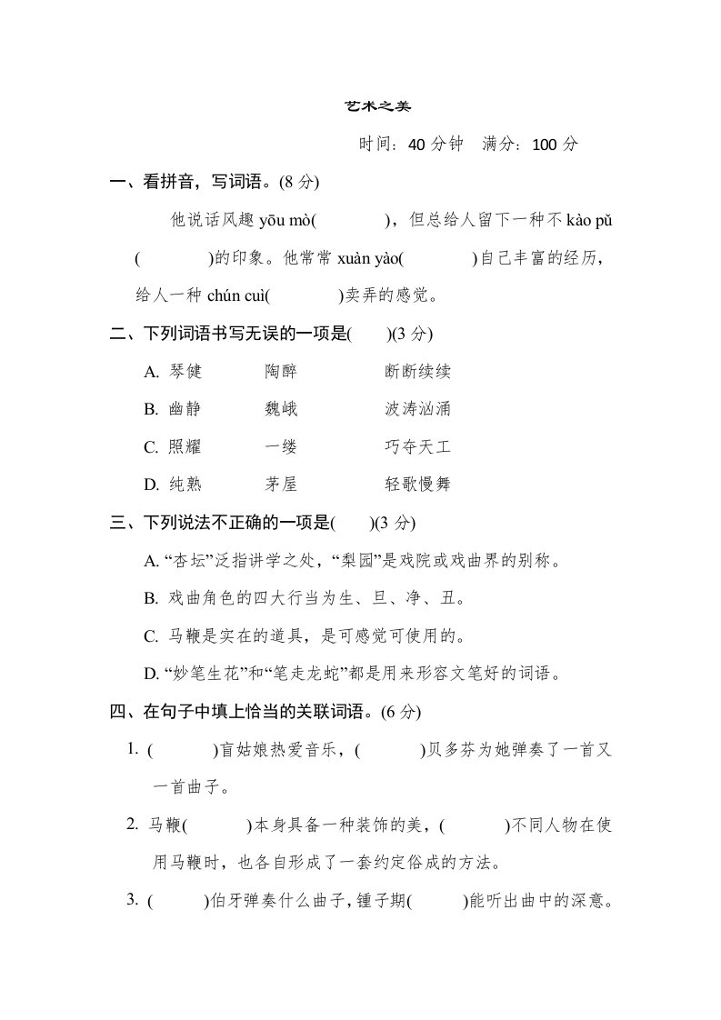 当前位置: 首页小学资源小学六年级正文 六年级语文上册“艺术之美”主题突破卷(部编版)_共7页 小学六年级 6 天前 0 0 5 以上为部分内容预览,如需源文档请登录您的会员账号进行下载! 声明:本站所有文章,如无特殊说明或标注,均为本站原创发布。任何个人或组织,在未征得本站同意时,禁止复制、盗用、采集、发布本站内容到任何网站、书籍等各类媒体平台。如若本站内容侵犯了原著者的合法权益,可联系我们进行处理。 尚学资源永久会员 打赏 收藏 海报 链接