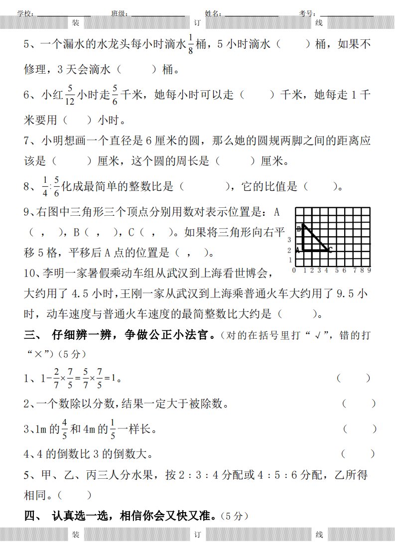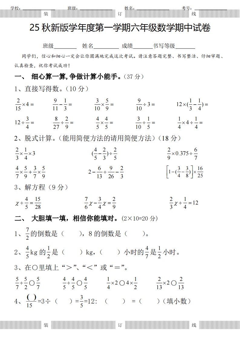 【2025秋新版】六年级数学期中试卷-六上数学_共5页