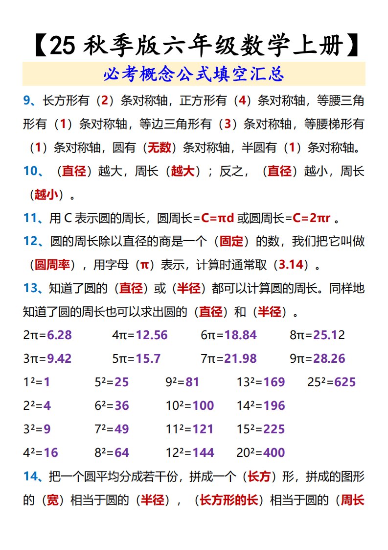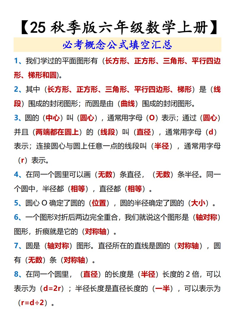 当前位置: 首页小学资源小学六年级正文 【2025秋新版】【六年级数学上册】必考概念公式填空汇总_共4页 小学六年级 6 天前 0 0 5 以上为部分内容预览,如需源文档请登录您的会员账号进行下载! 声明:本站所有文章,如无特殊说明或标注,均为本站原创发布。任何个人或组织,在未征得本站同意时,禁止复制、盗用、采集、发布本站内容到任何网站、书籍等各类媒体平台。如若本站内容侵犯了原著者的合法权益,可联系我们进行处理。 尚学资源永久会员 打赏 收藏 海报 链接