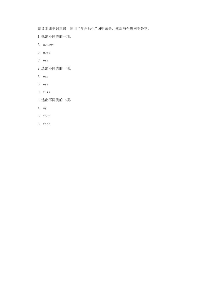 当前位置: 首页小学资源小学一年级正文 一年级英语上册Face习题(1)(人教一起点)_共3页 小学一年级 2 周前 0 0 5 以上为部分内容预览,如需源文档请登录您的会员账号进行下载! 声明:本站所有文章,如无特殊说明或标注,均为本站原创发布。任何个人或组织,在未征得本站同意时,禁止复制、盗用、采集、发布本站内容到任何网站、书籍等各类媒体平台。如若本站内容侵犯了原著者的合法权益,可联系我们进行处理。 尚学资源永久会员 打赏 收藏 海报 链接