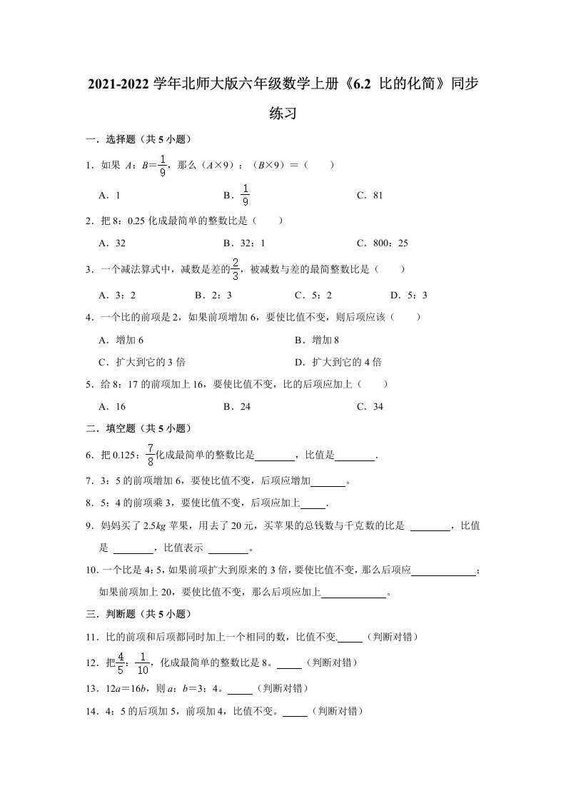 当前位置: 首页小学资源小学六年级正文 六年级数学上册6.2比的化简》同步练习(含解析)(北师大版)_共8页 小学六年级 7 天前 0 0 5 以上为部分内容预览,如需源文档请登录您的会员账号进行下载! 声明:本站所有文章,如无特殊说明或标注,均为本站原创发布。任何个人或组织,在未征得本站同意时,禁止复制、盗用、采集、发布本站内容到任何网站、书籍等各类媒体平台。如若本站内容侵犯了原著者的合法权益,可联系我们进行处理。 尚学资源永久会员 打赏 收藏 海报 链接