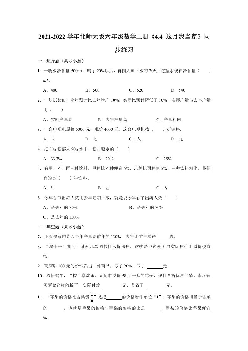 当前位置: 首页小学资源小学六年级正文 六年级数学上册4.4这月我当家》同步练习(有答案)(北师大版)_共8页 小学六年级 7 天前 0 0 5 以上为部分内容预览,如需源文档请登录您的会员账号进行下载! 声明:本站所有文章,如无特殊说明或标注,均为本站原创发布。任何个人或组织,在未征得本站同意时,禁止复制、盗用、采集、发布本站内容到任何网站、书籍等各类媒体平台。如若本站内容侵犯了原著者的合法权益,可联系我们进行处理。 尚学资源永久会员 打赏 收藏 海报 链接
