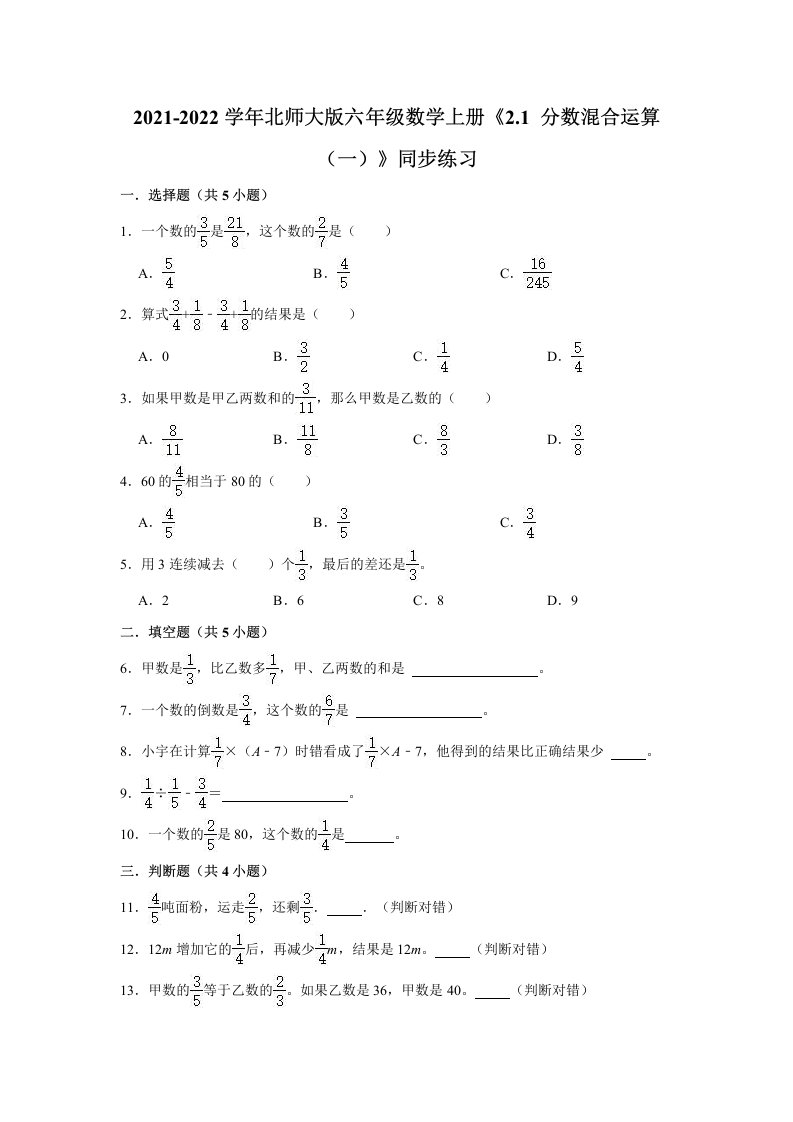 六年级数学上册2.1分数混合运算(一)》同步练习(有答案)(北师大版)_共8页